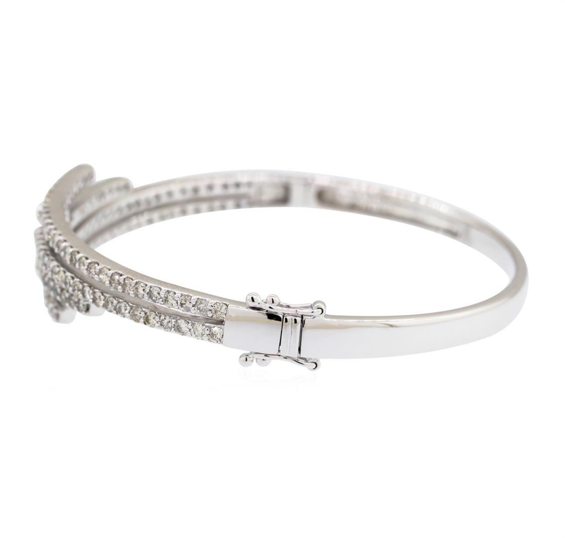 One electronically tested 14KT white gold lady's combination cast & assembled fashion four row bangle bracelet with a tongue clasp with double foldover safeties with a bypass motif with a bright polish finish. The featured lady's bracelet measures approximately six and a half inches in circumference. Identified with markings of '14K'. Condition is new, good workmanship. Containing: One Hundred Twenty-Two prong set round brilliant cut diamonds, measuring 1.90 - 1.80 x 1.15mm (depth est.) approximate total weight of 122 Stones = 2.97ct. Graded in the setting. Color I - J Clarity SI-2 to I-1 Cut Good Three prong set round brilliant cut diamonds, measuring 1.50 - 1.40 x 0.90mm (depth est.) approximate total weight of 3 Stones = 0.03ct. Graded in the setting. Color I - J Clarity SI-2 to I-1 Cut Good. Total Weight of Diamonds 3.00ct. Total Weight of Four Row Bangle Bracelet 18.70gm. GAS Appraised.