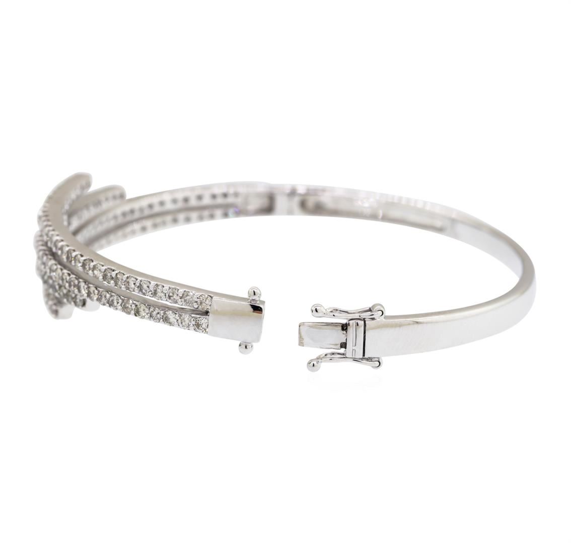 One electronically tested 14KT white gold lady's combination cast & assembled fashion four row bangle bracelet with a tongue clasp with double foldover safeties with a bypass motif with a bright polish finish. The featured lady's bracelet measures approximately six and a half inches in circumference. Identified with markings of '14K'. Condition is new, good workmanship. Containing: One Hundred Twenty-Two prong set round brilliant cut diamonds, measuring 1.90 - 1.80 x 1.15mm (depth est.) approximate total weight of 122 Stones = 2.97ct. Graded in the setting. Color I - J Clarity SI-2 to I-1 Cut Good Three prong set round brilliant cut diamonds, measuring 1.50 - 1.40 x 0.90mm (depth est.) approximate total weight of 3 Stones = 0.03ct. Graded in the setting. Color I - J Clarity SI-2 to I-1 Cut Good. Total Weight of Diamonds 3.00ct. Total Weight of Four Row Bangle Bracelet 18.70gm. GAS Appraised.