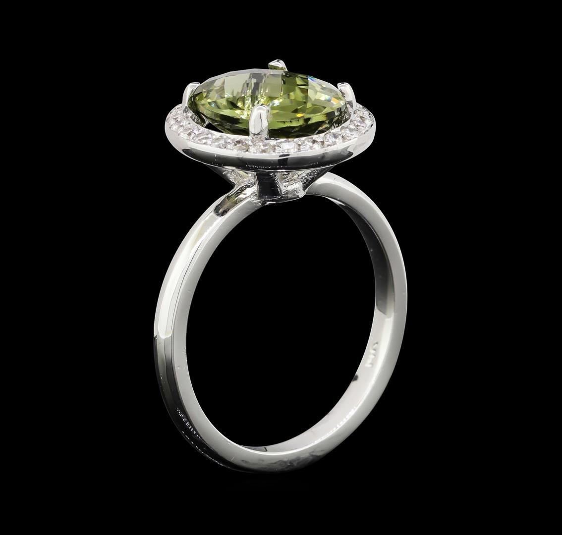 One electronically tested 14KT white gold lady's cast fashion ring with a basket halo with a bright polish finish. The featured lady's ring has a shank measuring 2.05 millimeters wide. Identified with markings of "14K". Condition is new, good workmanship. Containing: One prong set oval modified mixed cut natural green tourmaline, measuring 10.35 x 8.55 x 5.00mm, (depth est.) 5%. bulge factor, approximate weight of 3.00ct., clarity is eye clean, medium light, moderately strong, yellowish green color, (GIA yG 4/4), cut is very good. The featured gemstone has a checkerboard cut table. Transmitting light with no distortion, transparent. Colored gemstones are presumed to have been subjected to commonly used enhancement processes. Graded in the setting. Twenty-Four prong set round brilliant cut diamonds, measuring 1.40 - 1.30 x 0.81mm (depth est.) approximate total weight of 24 Stones = 0.21ct. Graded in the setting. Clarity: SI-1 to SI-2. Color: H - ICut Good. Total Weight of Colored Stones 3.00ct. Total Weight of Diamonds 0.21ct. Total Weight of Ring 4.70gm. GAS Appraised.