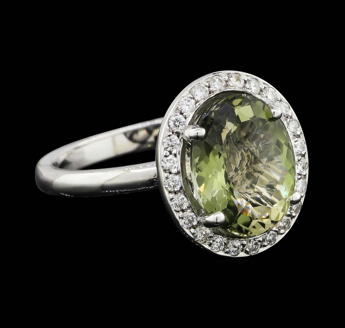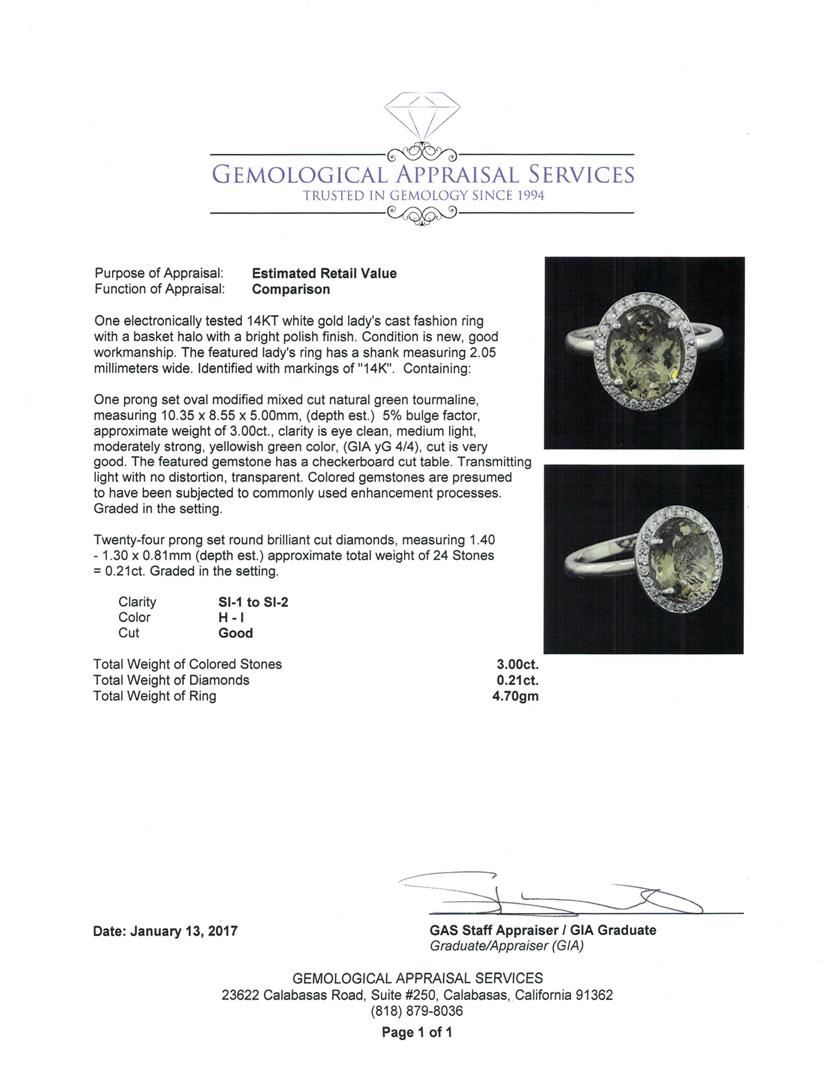 One electronically tested 14KT white gold lady's cast fashion ring with a basket halo with a bright polish finish. The featured lady's ring has a shank measuring 2.05 millimeters wide. Identified with markings of "14K". Condition is new, good workmanship. Containing: One prong set oval modified mixed cut natural green tourmaline, measuring 10.35 x 8.55 x 5.00mm, (depth est.) 5%. bulge factor, approximate weight of 3.00ct., clarity is eye clean, medium light, moderately strong, yellowish green color, (GIA yG 4/4), cut is very good. The featured gemstone has a checkerboard cut table. Transmitting light with no distortion, transparent. Colored gemstones are presumed to have been subjected to commonly used enhancement processes. Graded in the setting. Twenty-Four prong set round brilliant cut diamonds, measuring 1.40 - 1.30 x 0.81mm (depth est.) approximate total weight of 24 Stones = 0.21ct. Graded in the setting. Clarity: SI-1 to SI-2. Color: H - ICut Good. Total Weight of Colored Stones 3.00ct. Total Weight of Diamonds 0.21ct. Total Weight of Ring 4.70gm. GAS Appraised.