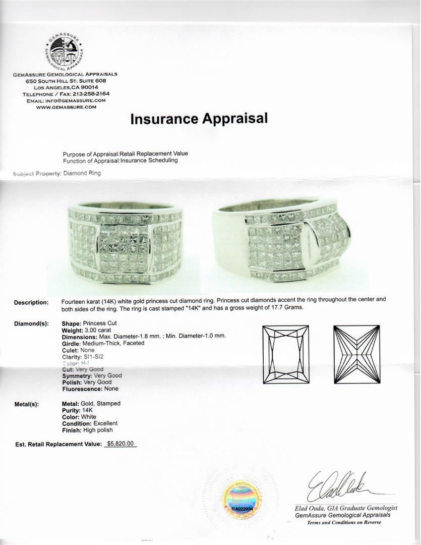One 14KT White Gold 3.00ctw Diamond Ring with a total weight of 17.7 grams. Diamonds with a total weight of 3.00cts with the color of (H-I) and clarity of (SI1-SI2). GGA Appraised at $5,820.00.