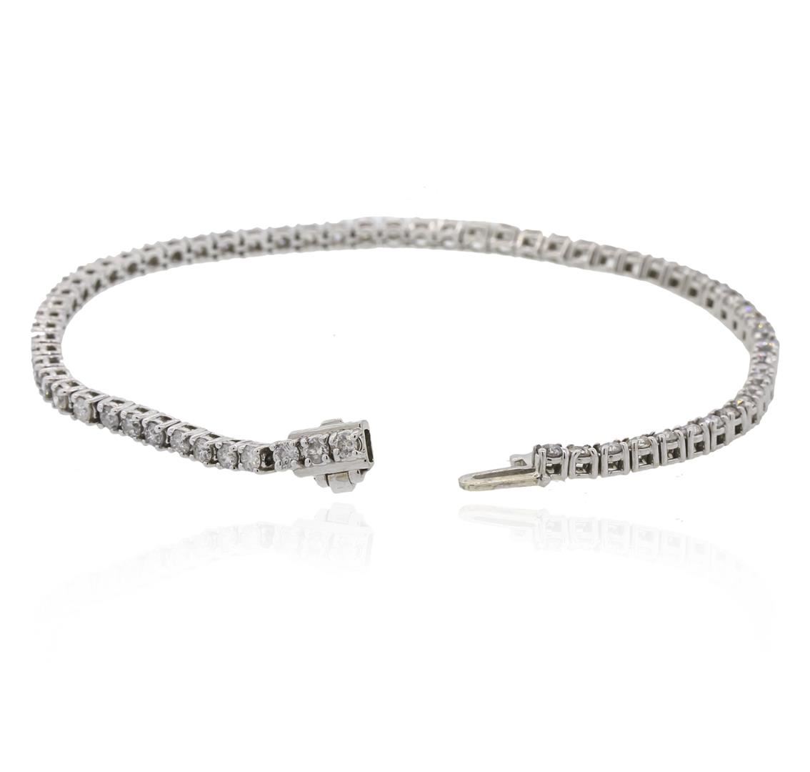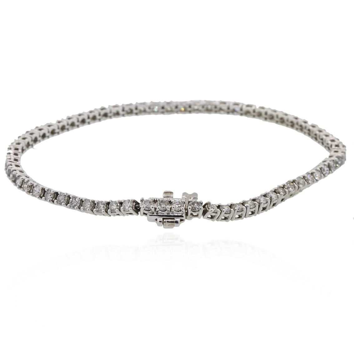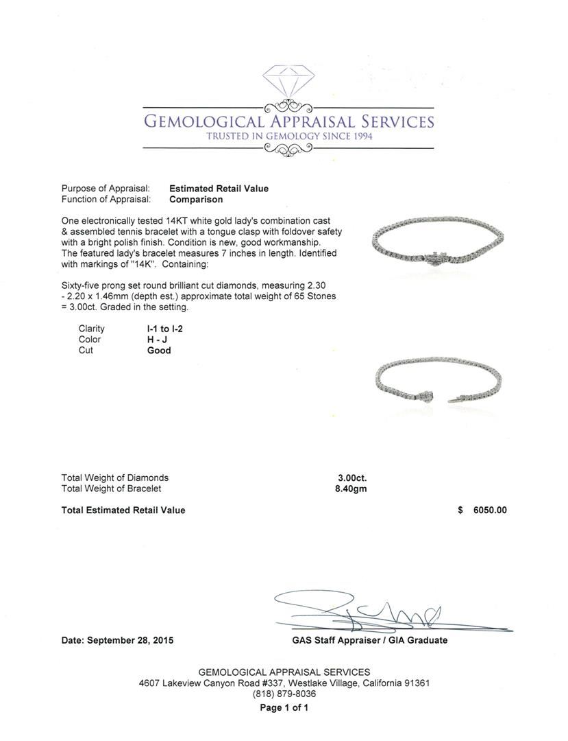 One electronically tested 14KT white gold lady's combination cast & assembled tennis bracelet with a tongue clasp with foldover safety with a bright polish finish. The featured lady's bracelet measures 7 inches in length. Identified with markings of "14K". Condition is new, good workmanship. Containing: Sixty-Five prong set round brilliant cut diamonds, measuring 2.30 - 2.20 x 1.46mm (depth est.) approximate total weight of 65 Stones = 3.00ct. Graded in the setting. Clarity: I-1 to I-2. Color: H - Good. Total Weight of Diamonds 3.00ct. Total Weight of Bracelet 8.40 grams. GAS Appraised at $6,050.00.