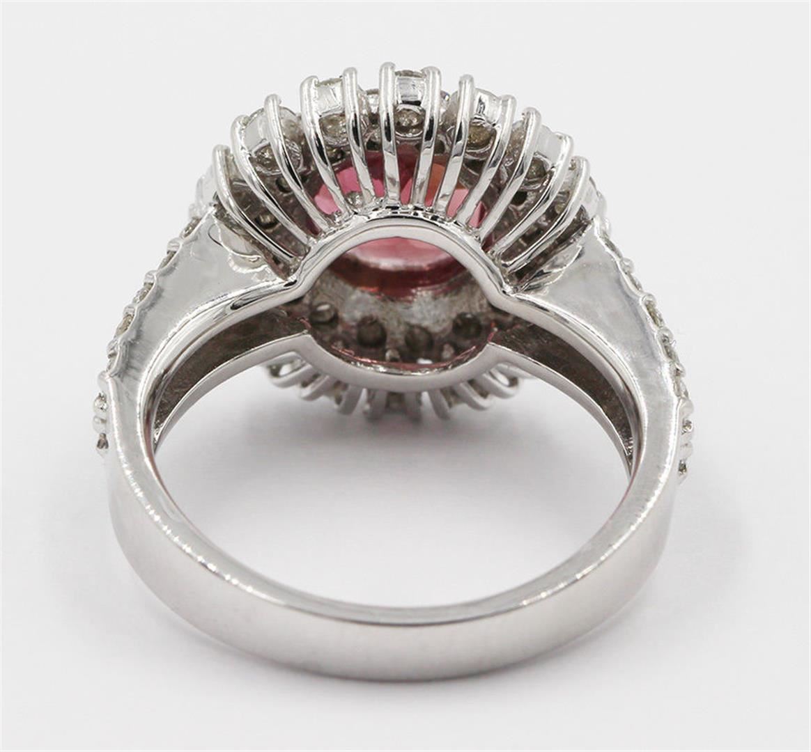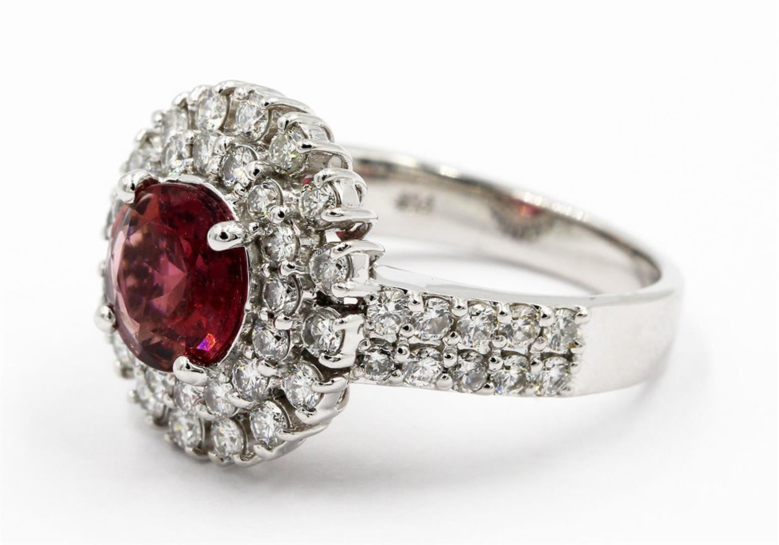 One Round Cut Pink Tourmaline Diamond Engagement Ring in 14k white gold. Ring is size 6.75 but resizable. Total carat weight is 3.03 carats. Setting style is solitaire with accents / halo design. Gross weight is 7.47 grams with a total of 53 stones. Condition is Brand new. Main stone is natural and non-enhanced. Main stone is 1.63 Ct, brilliant round cut shape, clarity is fine, color natural pink, and has a very good cut. Side stone is natural and non-enhanced. Side diamonds total carats is 1.40 Ct, brilliant round cut shape, clarity is SI-1, color G-H, and cut is very good. Total number of side diamonds is 52.