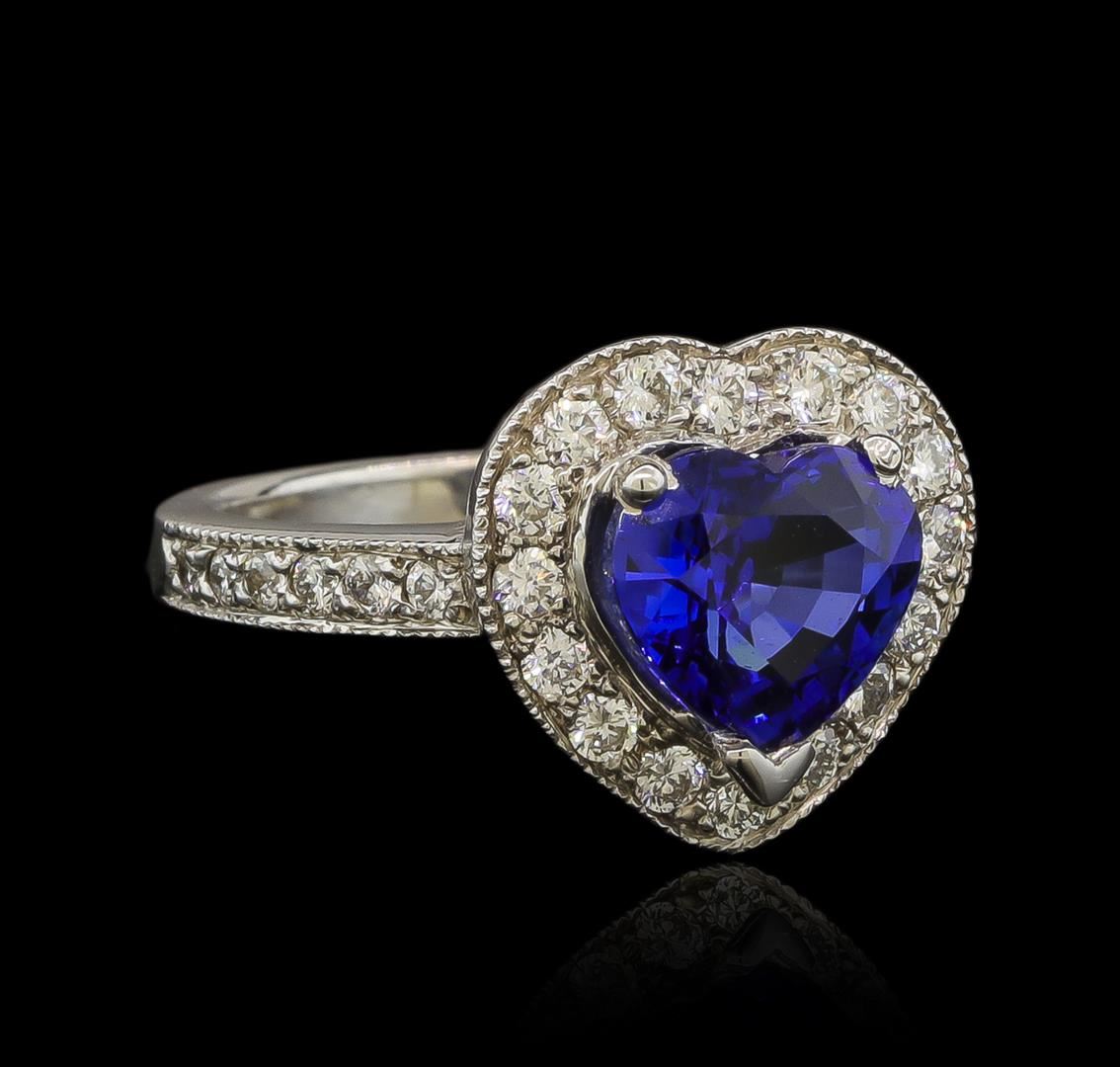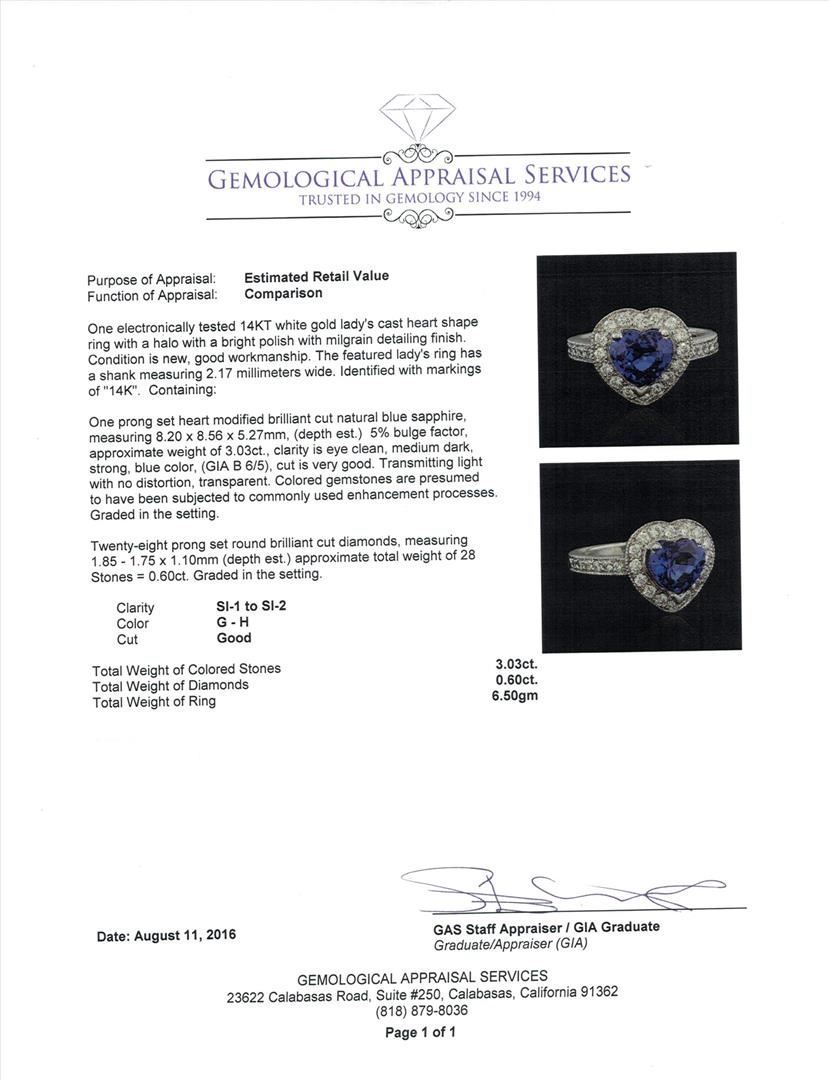 One electronically tested 14KT white gold lady's cast heart shape ring with a halo with a bright polish with milgrain detailing finish. The featured lady's ring has a shank measuring 2.17 millimeters wide. Identified with markings of "14K". Condition is new, good workmanship. Containing: One prong set heart modified brilliant cut natural blue sapphire, measuring 8.20 x 8.56 x 5.27mm, (depth est.) 5%. bulge factor, approximate weight of 3.03ct., clarity is eye clean, medium dark, strong, blue color, (GIA B 6/5), cut is very good. Transmitting light with no distortion, transparent. Colored gemstones are presumed to have been subjected to commonly used enhancement processes. Graded in the setting.Twenty-Eight prong set round brilliant cut diamonds, measuring 1.85 - 1.75 x 1.10mm (depth est.) approximate total weight of 28 Stones = 0.60ct. Graded in the setting. Clarity: SI-1 to SI-2. Color: G - HCut Good. Total Weight of Colored Stones 3.03ct. Total Weight of Diamonds 0.60ct. Total Weight of Ring 6.50gm. GAS Appraised.