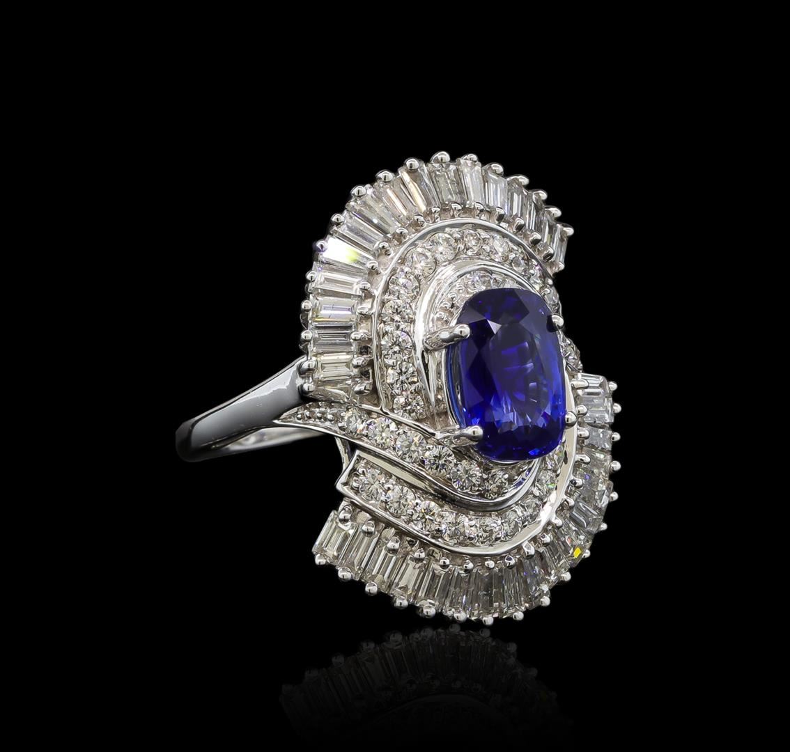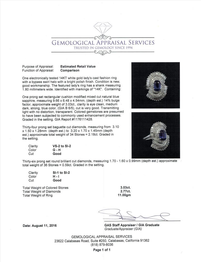 One electronically tested 14KT white gold lady's cast fashion ring with a bypass swirl halo with a bright polish finish. The featured lady's ring has a shank measuring 1.80 millimeters wide. Identified with markings of "14K". Condition is new, good workmanship. Containing: One prong set rectangular cushion modified mixed cut natural blue sapphire, measuring 9.66 x 6.48 x 4.54mm, (depth est.) 14%. bulge factor, approximate weight of 3.03ct., clarity is eye clean, medium dark, strong, blue color, (GIA B 6/5), cut is very good. Transmitting light with no distortion, transparent. Colored gemstones are presumed to have been subjected to commonly used enhancement processes. Graded in the setting. GIA Report #1176111428.Thirty-Four prong set baguette cut diamonds, measuring from 3.10 x 1.50 x 1.28mm (depth est.) to 3.20 x 1.70 x 1.45mm (depth est.) approximate total weight of 34 Stones = 2.18ct. Graded in the setting. Clarity: VS-2 to SI-2. Color: G - HCut Good Thirty-Six prong set round brilliant cut diamonds, measuring 1.70 - 1.60 x 0.99mm (depth est.) approximate total weight of 36 Stones = 0.59ct. Graded in the setting. Clarity: SI-1 to SI-2. Color: H - ICut Good. Total Weight of Colored Stones 3.03ct. Total Weight of Diamonds 2.77ct. Total Weight of Ring 11.00gm. GAS Appraised.