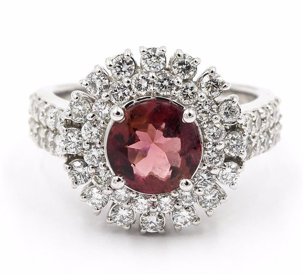 One Round Cut Pink Tourmaline Diamond Engagement Ring in 14k white gold. Ring is size 6.75 but resizable. Total carat weight is 3.03 carats. Setting style is solitaire with accents / halo design. Gross weight is 7.47 grams with a total of 53 stones. Condition is Brand new. Main stone is natural and non-enhanced. Main stone is 1.63 Ct, brilliant round cut shape, clarity is fine, color natural pink, and has a very good cut. Side stone is natural and non-enhanced. Side diamonds total carats is 1.40 Ct, brilliant round cut shape, clarity is SI-1, color G-H, and cut is very good. Total number of side diamonds is 52.