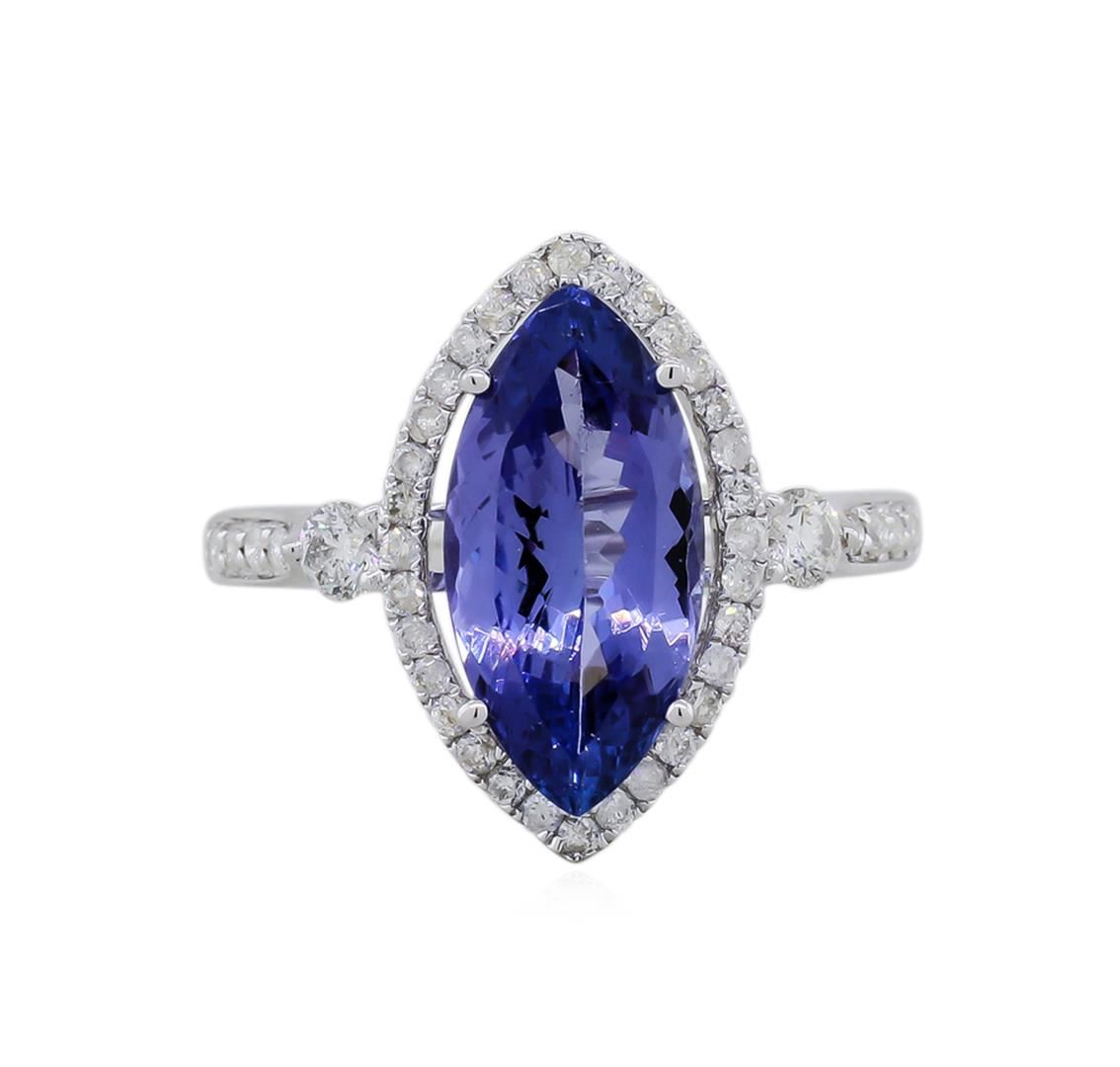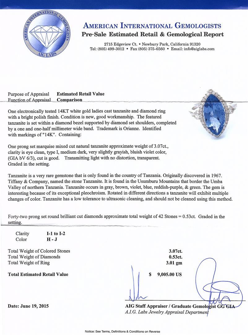 One electronically tested 14KT white gold ladies cast tanzanite and diamond ring with a bright polish finish. The featured tanzanite is set within a diamond bezel supported by diamond set shoulders, completed by a one and one-half millimeter wide band. Trademark is Orianne. Identified with markings of "14K". Condition is new, good workmanship. Containing: One prong set marquise mixed cut natural tanzanite approximate weight of 3.07ct., clarity is eye clean, type I, medium dark, very slightly grayish, bluish violet color, (GIA bV 6/3), cut is good. Transmitting light with no distortion, transparent. Graded in the setting.Tanzanite is a very rare gemstone that is only found in the country of Tanzania. Originally discovered in 1967. Tiffany & Company, named the stone Tanzanite. It is found in the Usumburu Mountains that border the Umba Valley of northern Tanzania. Tanzanite occurs in gray, brown, violet, blue, reddish-purple, & green. The gem is interesting because of its exceptional pleochroism. Rotated in different directions a tanzanite will exhibit multiple changes of color. Tanzanite has a low tolerance to ultrasonic cleaning, and should not be cleaned using this method.Forty-Two prong set round brilliant cut diamonds approximate. Total Weight of 42 Stones = 0.53ct. Graded in the setting. Clarity: I-1 to I-2. Color: H - J. Total Weight of Colored Stones 3.07ct. Total Weight of Diamonds 0.53ct. AIG Appraised at $9,005.00.