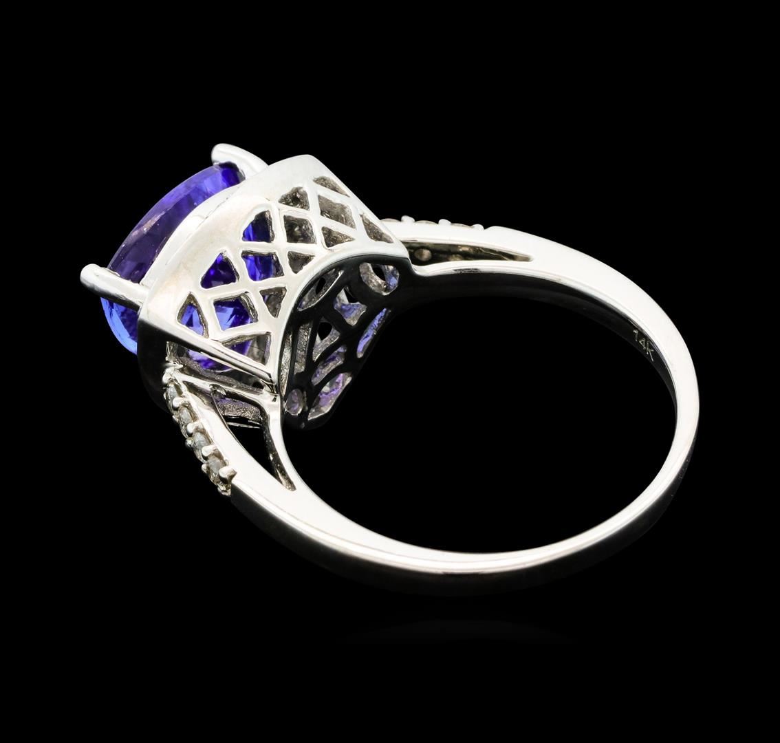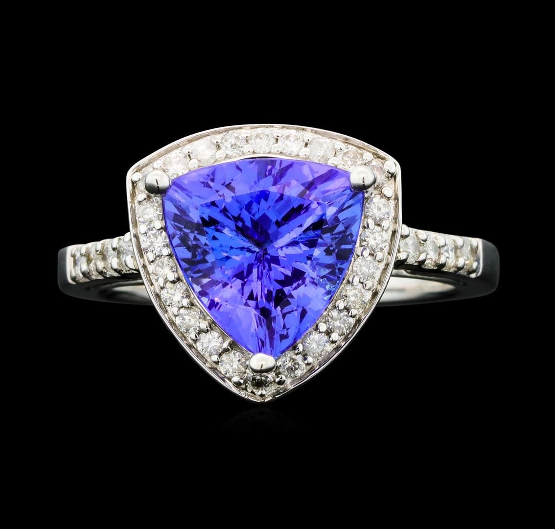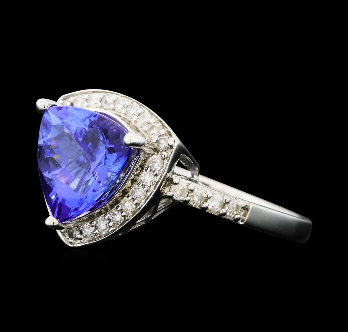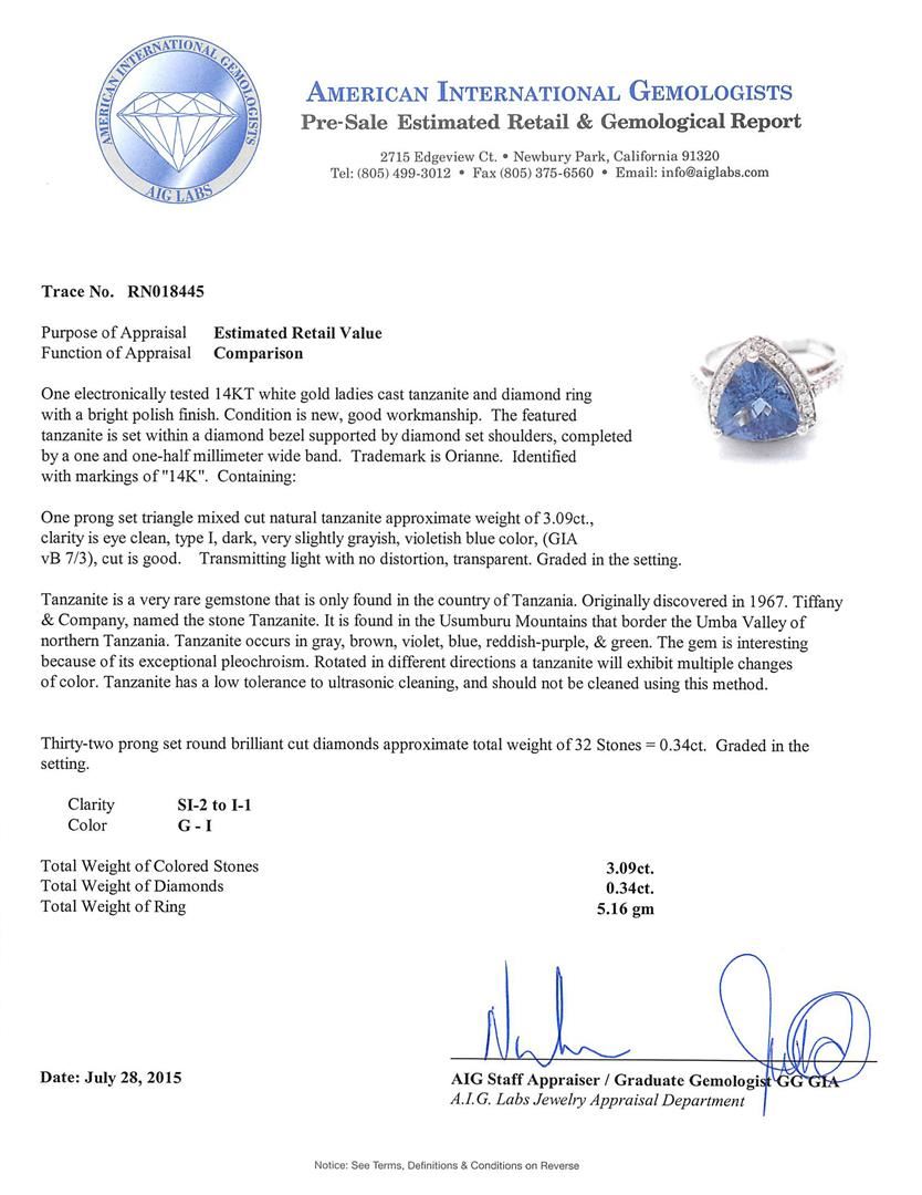 One electronically tested 14KT white gold ladies cast tanzanite and diamond ring with a bright polish finish. The featured tanzanite is set within a diamond bezel supported by diamond set shoulders, completed by a one and one-half millimeter wide band. Trademark is Orianne. Identified with markings of "14K". Condition is new, good workmanship. Containing: One prong set triangle mixed cut natural tanzanite approximate weight of 3.09ct., clarity is eye clean, type I, dark, very slightly grayish, violetish blue color, (GIA vB 7/3), cut is good. Transmitting light with no distortion, transparent. Graded in the setting.Tanzanite is a very rare gemstone that is only found in the country of Tanzania. Originally discovered in 1967. Tiffany & Company, named the stone Tanzanite. It is found in the Usumburu Mountains that border the Umba Valley of northern Tanzania. Tanzanite occurs in gray, brown, violet, blue, reddish-purple, & green. The gem is interesting because of its exceptional pleochroism. Rotated in different directions a tanzanite will exhibit multiple changes of color. Tanzanite has a low tolerance to ultrasonic cleaning, and should not be cleaned using this method.Thirty-Two prong set round brilliant cut diamonds approximate total weight of 32 Stones = 0.34ct. Graded in the setting. Clarity: SI-2 to I-1. Color: G - I. Total Weight of Colored Stones 3.09ct. Total Weight of Diamonds 0.34ct. Total Weight of Ring 5.16gm. AIG Appraised.