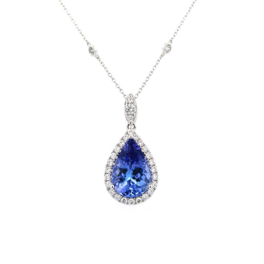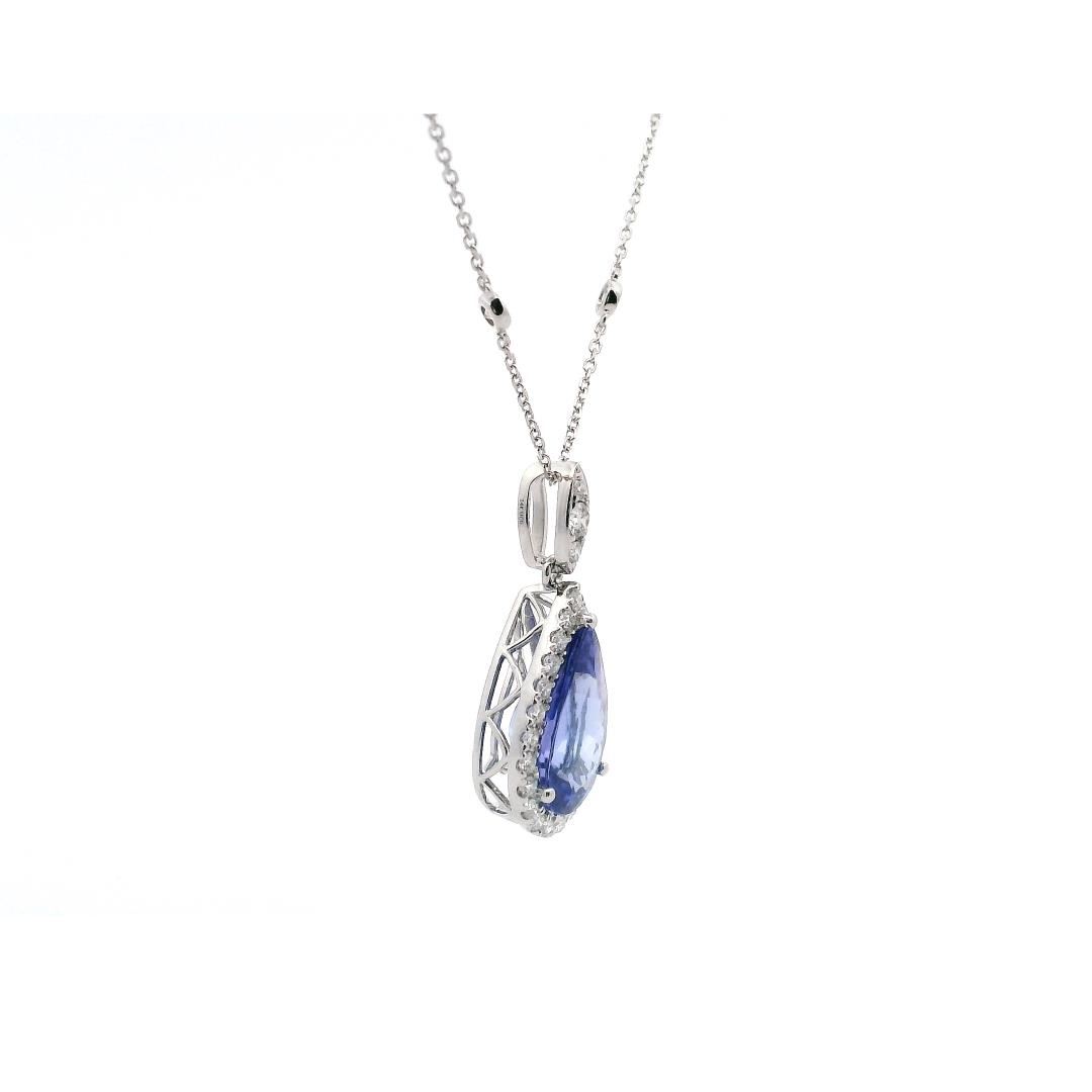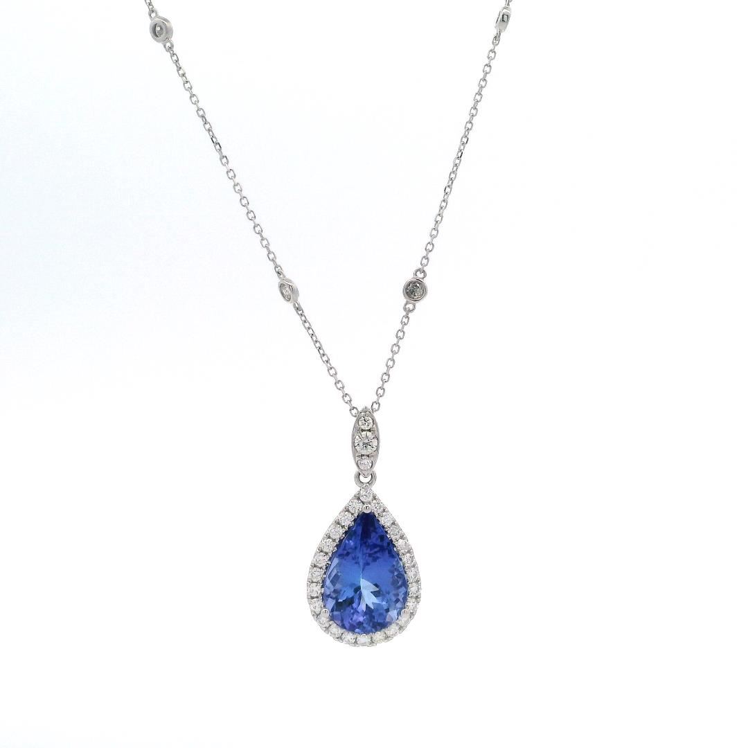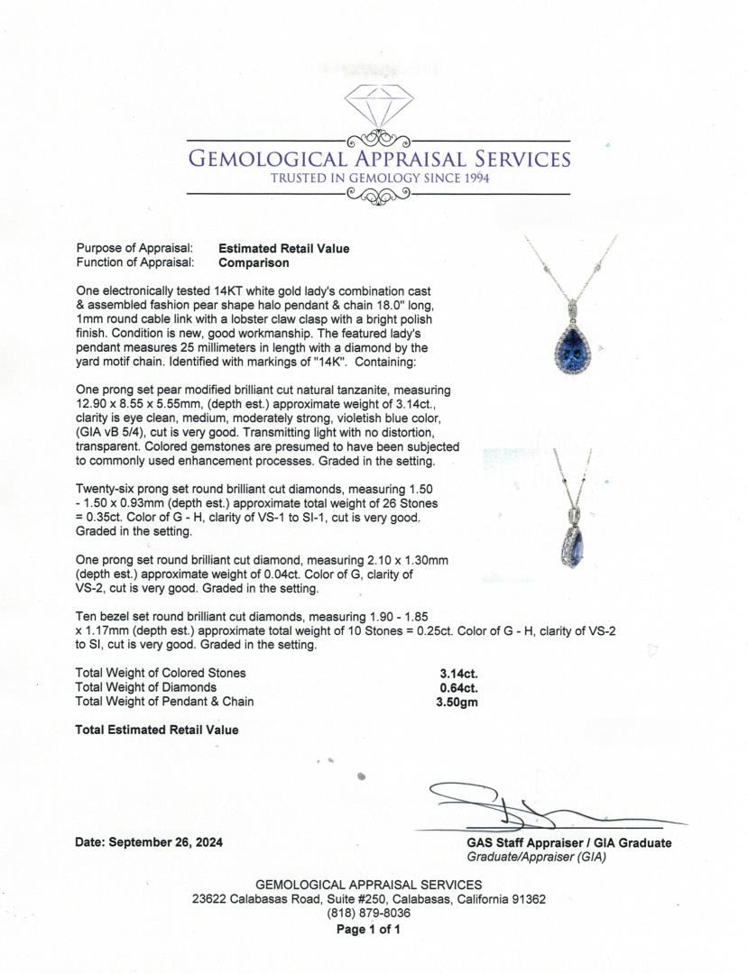 One electronically tested 14KT white gold lady's combination cast & assembled fashion pear shape halo pendant & chain 18.0" long, 1mm round cable link with a lobster claw clasp with a bright polish finish. The featured lady's pendant measures 25 millimeters in length with a diamond by the yard motif chain. Identified with markings of "14K". Condition is new, good workmanship.Containing: One prong set pear modified brilliant cut natural tanzanite, measuring 12.90 x 8.55 x 5.55mm, (depth est.) approximate weight of 3.14ct., clarity is eye clean, medium, moderately strong, violetish blue color, (GIA vB 5/4), cut is very good. Transmitting light with no distortion, transparent. Colored gemstones are presumed to have been subjected to commonly used enhancement processes. Graded in the setting.Twenty-Six prong set round brilliant cut diamonds, measuring 1.50 - 1.50 x 0.93mm (depth est.) approximate total weight of 26 Stones = 0.35ct. Graded in the setting. Color: G - H. Clarity: VS-1 to SI-1. Cut: Very Good. One prong set round brilliant cut diamond, measuring 2.10 x 1.30mm (depth est.) approximate weight of 0.04ct. Graded in the setting. Color:G. Clarity: VS-2. Cut: Very Good. Ten bezel set round brilliant cut diamonds, measuring 1.90 - 1.85 x 1.17mm (depth est.) approximate total weight of 10 Stones = 0.25ct. Graded in the setting. Color: G - H. Clarity: VS-2 to SI. Cut: Very Good. Total Weight of Colored Stones: 3.14ct. Total Weight of Diamonds: 0.64ct. Total Weight of Pendant & Chain: 3.50gm. Appraised by Gemological Appraisal Services. GAS Appraised.