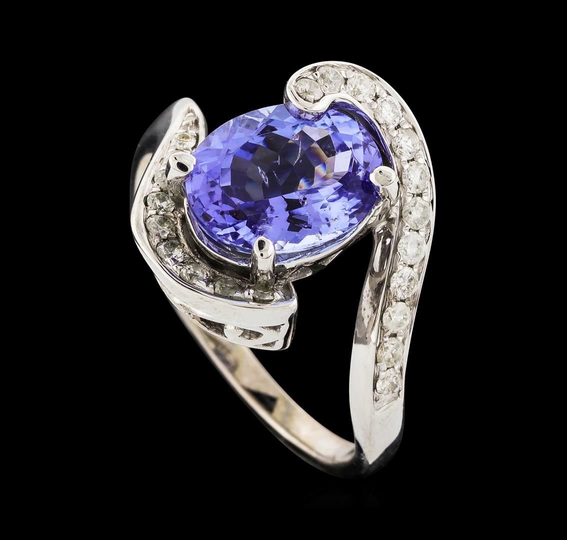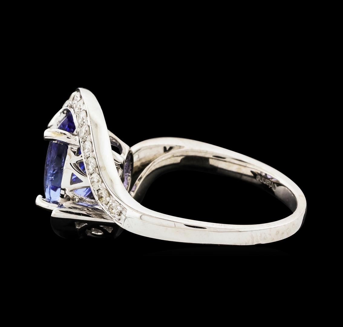 One electronically tested 14KT white gold ladies cast tanzanite and diamond ring with a bright polish finish. The featured tanzanite is set within a diamond bypass design, completed by a one and one-half millimeter wide band. Trademark is Orianne. Identified with markings of "14K". Condition is new, good workmanship. Containing: One prong set oval mixed cut natural tanzanite approximate weight of 3.17ct., clarity is slightly included, type I, medium light, very slightly grayish, bluish violet color, (GIA bV 4/3), cut is good. Transmitting light with a minimum of distortion, transparent. Naturally occurring internal & external characteristics are present. Graded in the setting. Tanzanite is a very rare gemstone that is only found in the country of Tanzania. Originally discovered in 1967. Tiffany & Company, named the stone Tanzanite. It is found in the Usumburu Mountains that border the Umba Valley of northern Tanzania. Tanzanite occurs in gray, brown, violet, blue, reddish-purple, & green. The gem is interesting because of its exceptional pleochroism. Rotated in different directions a tanzanite will exhibit multiple changes of color. Tanzanite has a low tolerance to ultrasonic cleaning, and should not be cleaned using this method. Eighteen prong set round brilliant cut diamonds approximate total weight of 18 Stones = 0.33ct. Graded in the setting. Clarity: I-1 to I-2. Color: G - I. Total Weight of Colored Stones 3.17ct. Total Weight of Diamonds 0.33ct. Total Weight of Ring 5.77gm. AIG Appraised at $5,770.00.