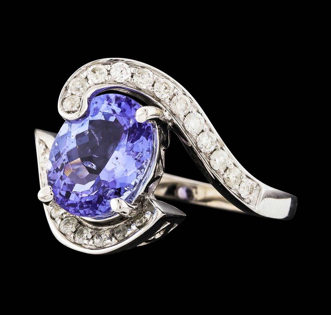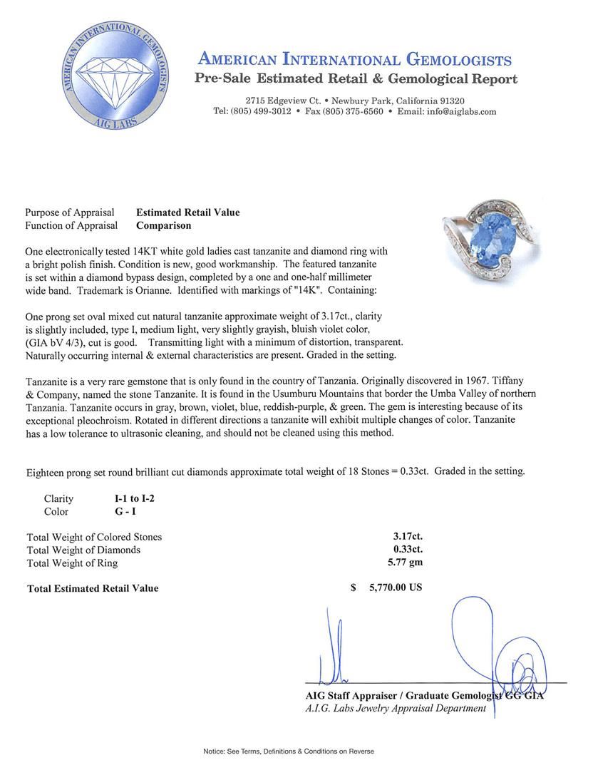 One electronically tested 14KT white gold ladies cast tanzanite and diamond ring with a bright polish finish. The featured tanzanite is set within a diamond bypass design, completed by a one and one-half millimeter wide band. Trademark is Orianne. Identified with markings of "14K". Condition is new, good workmanship. Containing: One prong set oval mixed cut natural tanzanite approximate weight of 3.17ct., clarity is slightly included, type I, medium light, very slightly grayish, bluish violet color, (GIA bV 4/3), cut is good. Transmitting light with a minimum of distortion, transparent. Naturally occurring internal & external characteristics are present. Graded in the setting. Tanzanite is a very rare gemstone that is only found in the country of Tanzania. Originally discovered in 1967. Tiffany & Company, named the stone Tanzanite. It is found in the Usumburu Mountains that border the Umba Valley of northern Tanzania. Tanzanite occurs in gray, brown, violet, blue, reddish-purple, & green. The gem is interesting because of its exceptional pleochroism. Rotated in different directions a tanzanite will exhibit multiple changes of color. Tanzanite has a low tolerance to ultrasonic cleaning, and should not be cleaned using this method. Eighteen prong set round brilliant cut diamonds approximate total weight of 18 Stones = 0.33ct. Graded in the setting. Clarity: I-1 to I-2. Color: G - I. Total Weight of Colored Stones 3.17ct. Total Weight of Diamonds 0.33ct. Total Weight of Ring 5.77gm. AIG Appraised at $5,770.00.