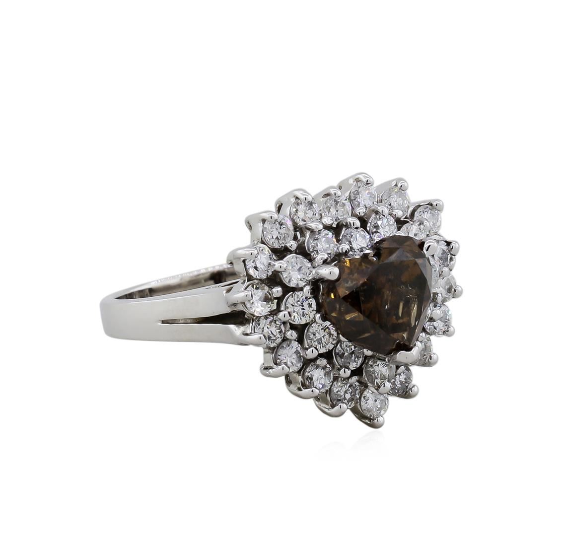 One electronically tested 14KT white gold ladies cast diamond ring with a bright polish finish. The featured diamond is set within a diamond mirroring diamond frame, supported by split shoulders, completed by a two millimeter wide band. Identified with markings of "14K". Condition is new, good workmanship. Containing: One prong set heart shaped cut diamond, measuring 8.30 x 7.40 x 5.76mm (depth est.) approximate. Total Weight of 2.12ct. Graded in the setting. Clarity: I-2. Color: Fancy Dark Yellowish BrownDepth 69.4%. Table 60.2%. Thirty-One prong set round brilliant cut diamonds approximate. Total Weight of 31 Stones = 1.10ct. Graded in the setting. Clarity: SI-1 to I-1. Color: G - I. Total Weight of Diamonds 3.22ct. AIG Appraised at $11,430.00.
