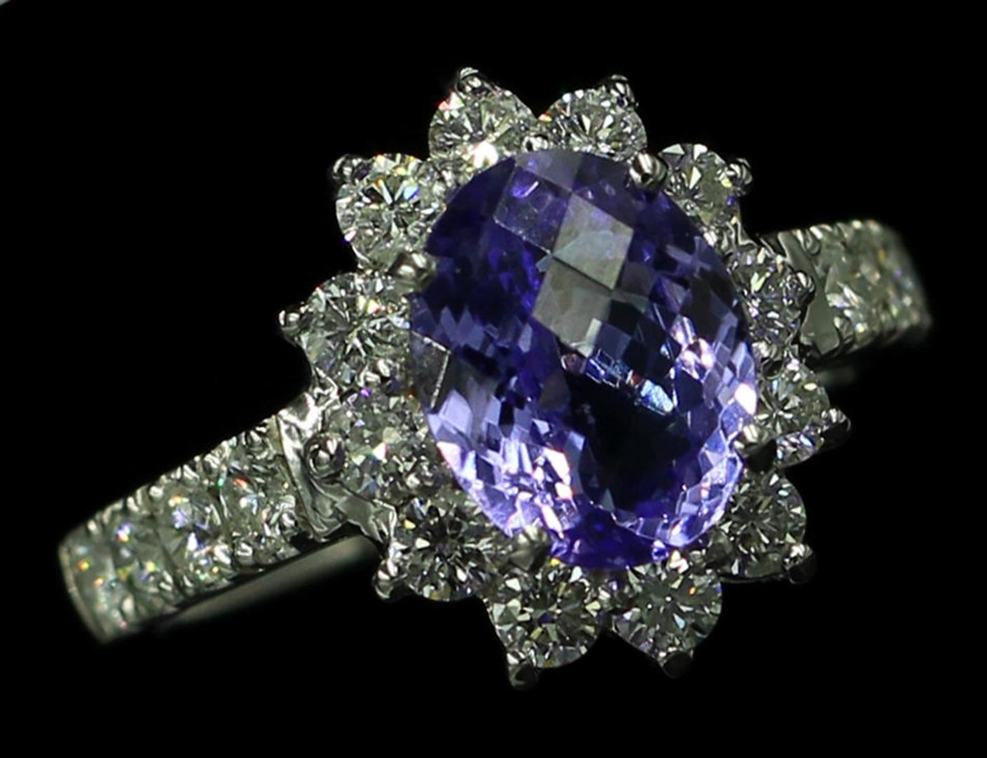 One Oval Cut Tanzanite Diamond Anniversary Band Ring in 14k White Gold. Size 6.50 but resizable. Total Carat weight is 3.26 Ct. Setting style is solitaire with accents / rare gem. Gross weight is 4.16 grams. Total stones is 25. Condition is brand new. Main stone is natural and non-enhanced. Main diamond carat is 2.12 Ct, shape oval, clarity fine medium color, color is blue tanzanite, and cut is very good. Side stone is natural and non-enhanced. Side stone total carats is 1.14 Ct. Shape is brilliant round cut, clarity is SI-1, color G-H, cut is very good, and number of side diamonds is 24.