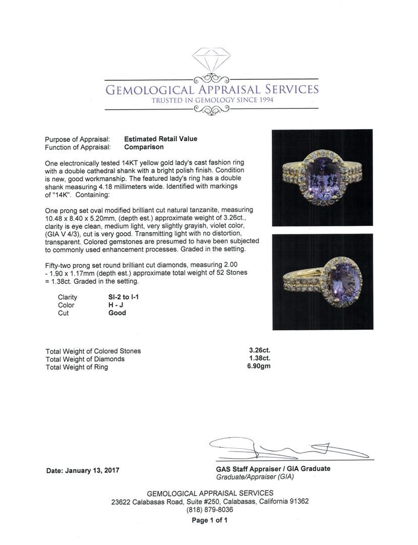 One electronically tested 14KT yellow gold lady's cast fashion ring with a double cathedral shank with a bright polish finish. The featured lady's ring has a double shank measuring 4.18 millimeters wide. Identified with markings of "14K". Condition is new, good workmanship. Containing: One prong set oval modified brilliant cut natural tanzanite, measuring 10.48 x 8.40 x 5.20mm, (depth est.) approximate weight of 3.26ct., clarity is eye clean, medium light, very slightly grayish, violet color, (GIA V 4/3), cut is very good. Transmitting light with no distortion, transparent. Colored gemstones are presumed to have been subjected to commonly used enhancement processes. Graded in the setting. Fifty-Two prong set round brilliant cut diamonds, measuring 2.00 - 1.90 x 1.17mm (depth est.) approximate total weight of 52 Stones = 1.38ct. Graded in the setting. Clarity: SI-2 to I-1. Color: H - JCut Good. Total Weight of Colored Stones 3.26ct. Total Weight of Diamonds 1.38ct. Total Weight of Ring 6.90gm. GAS Appraised.