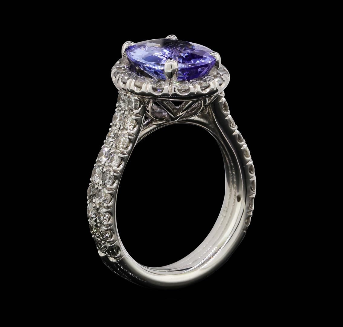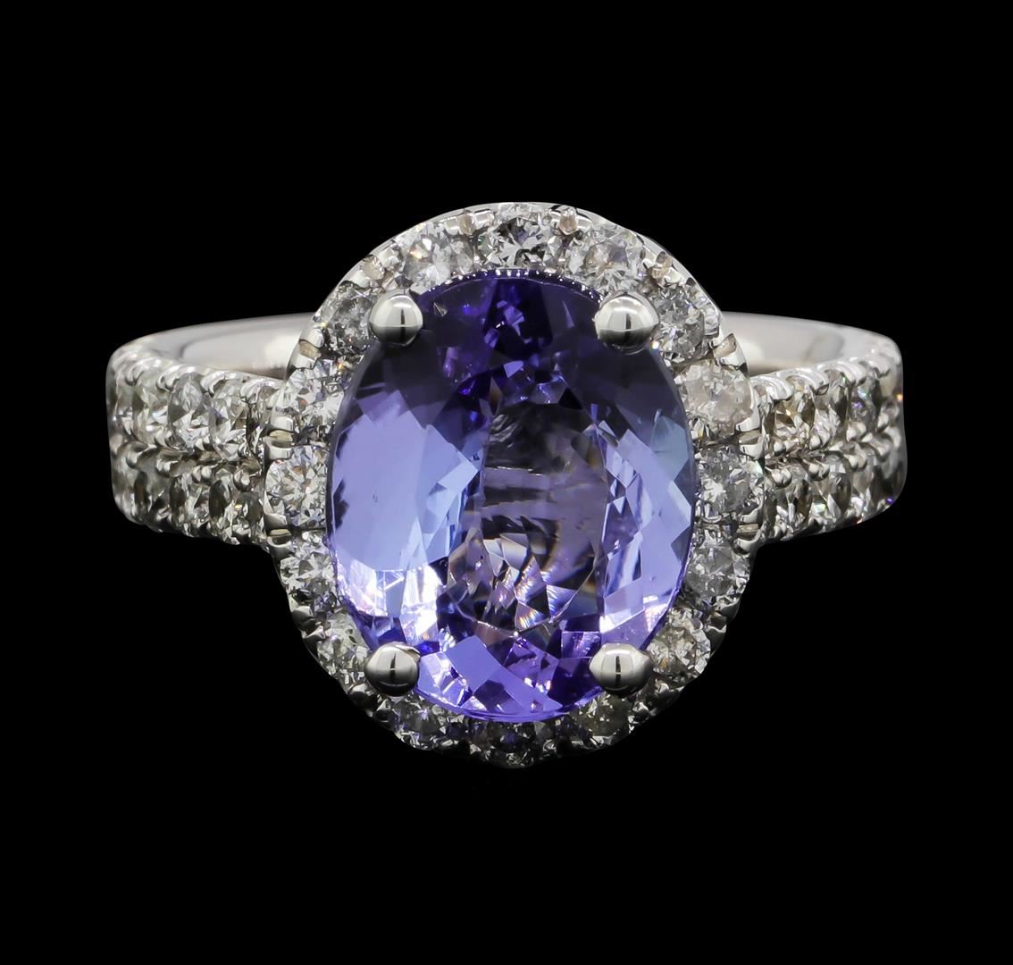 One electronically tested 14KT white gold lady's cast fashion ring with a double cathedral shank with a bright polish finish. The featured lady's ring has a double shank measuring 4.18 millimeters wide. Identified with markings of "14K". Condition is new, good workmanship. Containing: One prong set oval modified brilliant cut natural tanzanite, measuring 11.05 x 9.10 x 4.70mm, (depth est.) approximate weight of 3.29ct., clarity is eye clean, medium light, very slightly grayish, violet color, (GIA V 4/3), cut is good. Transmitting light with no distortion, transparent. Colored gemstones are presumed to have been subjected to commonly used enhancement processes. Graded in the setting. Fifty-Two prong set round brilliant cut diamonds, measuring 2.10 - 2.00 x 1.25mm (depth est.) approximate total weight of 52 Stones = 1.67ct. Graded in the setting. Clarity: SI-1 to I-1. Color: H - JCut Good. Total Weight of Colored Stones 3.29ct. Total Weight of Diamonds 1.67ct. Total Weight of Ring 6.60gm. GAS Appraised.
