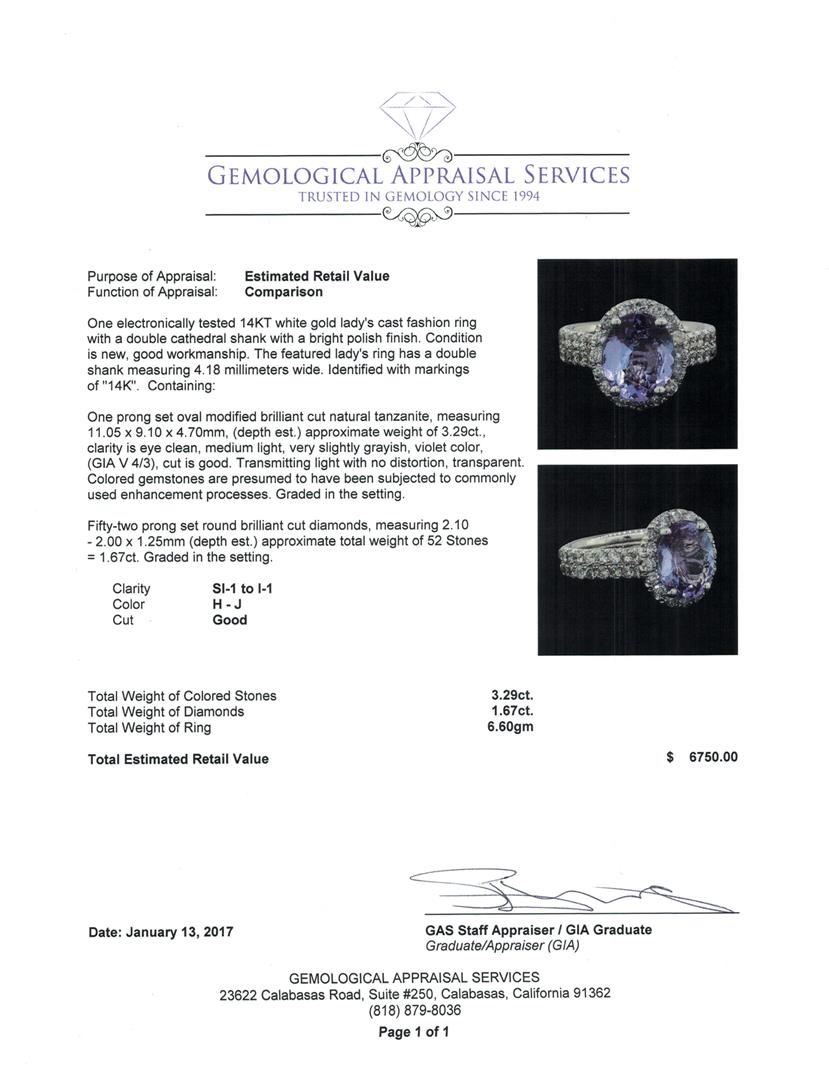 One electronically tested 14KT white gold lady's cast fashion ring with a double cathedral shank with a bright polish finish. The featured lady's ring has a double shank measuring 4.18 millimeters wide. Identified with markings of "14K". Condition is new, good workmanship. Containing: One prong set oval modified brilliant cut natural tanzanite, measuring 11.05 x 9.10 x 4.70mm, (depth est.) approximate weight of 3.29ct., clarity is eye clean, medium light, very slightly grayish, violet color, (GIA V 4/3), cut is good. Transmitting light with no distortion, transparent. Colored gemstones are presumed to have been subjected to commonly used enhancement processes. Graded in the setting. Fifty-Two prong set round brilliant cut diamonds, measuring 2.10 - 2.00 x 1.25mm (depth est.) approximate total weight of 52 Stones = 1.67ct. Graded in the setting. Clarity: SI-1 to I-1. Color: H - JCut Good. Total Weight of Colored Stones 3.29ct. Total Weight of Diamonds 1.67ct. Total Weight of Ring 6.60gm. GAS Appraised at $6,750.00.