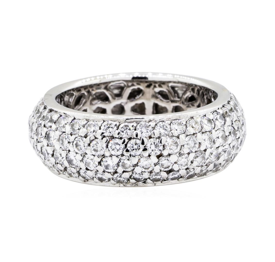One electronically tested 14KT white gold lady's cast wide band eternity ring with a bright polish finish. The featured lady's ring has a shank measuring 7.4 millimeters wide. Condition is new, good workmanship. Containing: One Hundred Forty prong set round brilliant cut diamonds, measuring 1.90 - 1.80 x 1.15mm (depth est.) approximate total weight of 140 Stones = 3.40ct. Graded in the setting. Color I - J Clarity VS-2 to SI-2 Cut Very Good. Total Weight of Diamonds 3.40ct.. Total Weight of Ring 8.90gm. GAS Appraised.