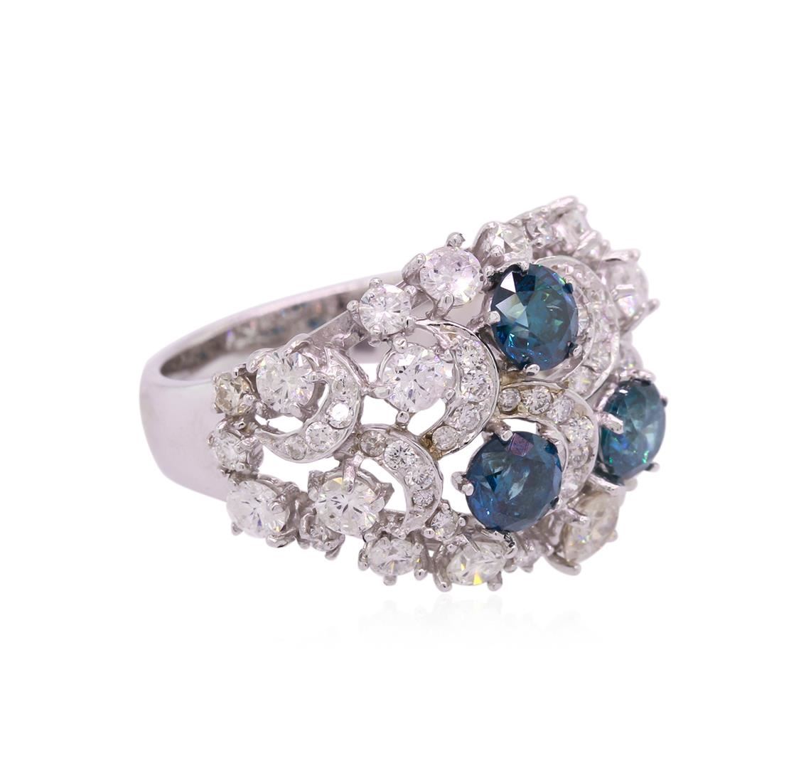 One electronically tested 14KT white gold lady's cast fashion ring with a bright polish finish. The featured lady's ring has a shank measuring 3.62 millimeters wide. Identified with markings of "14K". Condition is new, good workmanship. Containing: Three prong set round brilliant cut diamonds, measuring 4.80 - 4.70 x 3.10mm (depth est.) , 5.00% GTCF approximate total weight of 3 Stones = 1.38ct. Colored gemstones are presumed to have been subjected to commonly used enhancement processes. Graded in the setting. Clarity: SI-2 to I-1 Cut Good One prong set round brilliant cut diamond, measuring 4.10 - 4.00 x 2.63mm (depth est.) approximate weight of 0.26ct. Graded in the setting. Clarity: I-1. Color: J - K. Cut Good Twelve prong set round brilliant cut diamonds, measuring 2.90 - 2.80 x 1.77mm (depth est.) approximate total weight of 12 Stones = 1.05ct. Graded in the setting. Clarity: SI-2 to I-1. Color: H - I. Cut Good Seven prong set round brilliant cut diamonds, measuring 2.50 - 2.40 x 1.59mm (depth est.) approximate total weight of 7 Stones = 0.41ct. Graded in the setting. Clarity: SI-1 to SI-2. Color: H - I. Cut Good Nine prong set round brilliant cut diamonds, measuring 1.70 - 1.60 x 1.07mm (depth est.) approximate total weight of 9 Stones = 0.16ct. Graded in the setting. Clarity: SI-1 to SI-2. Color: H - I. Cut Good Thirty-Two bead set round brilliant cut diamonds, measuring 1.20 - 1.00 x 0.66mm (depth est.) approximate total weight of 32 Stones = 0.15ct. Graded in the setting. Clarity: SI-1 to SI-2. Color: H - I. Cut Good. Total Weight of Diamonds 3.41ct. Total Weight of Ring 6.80gm. GAS Appraised at $10,555.00.