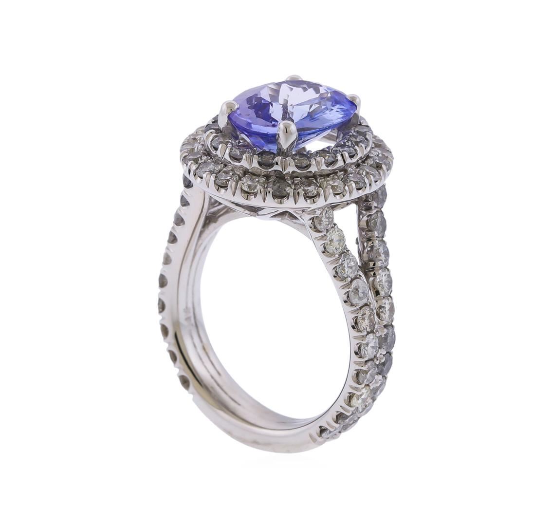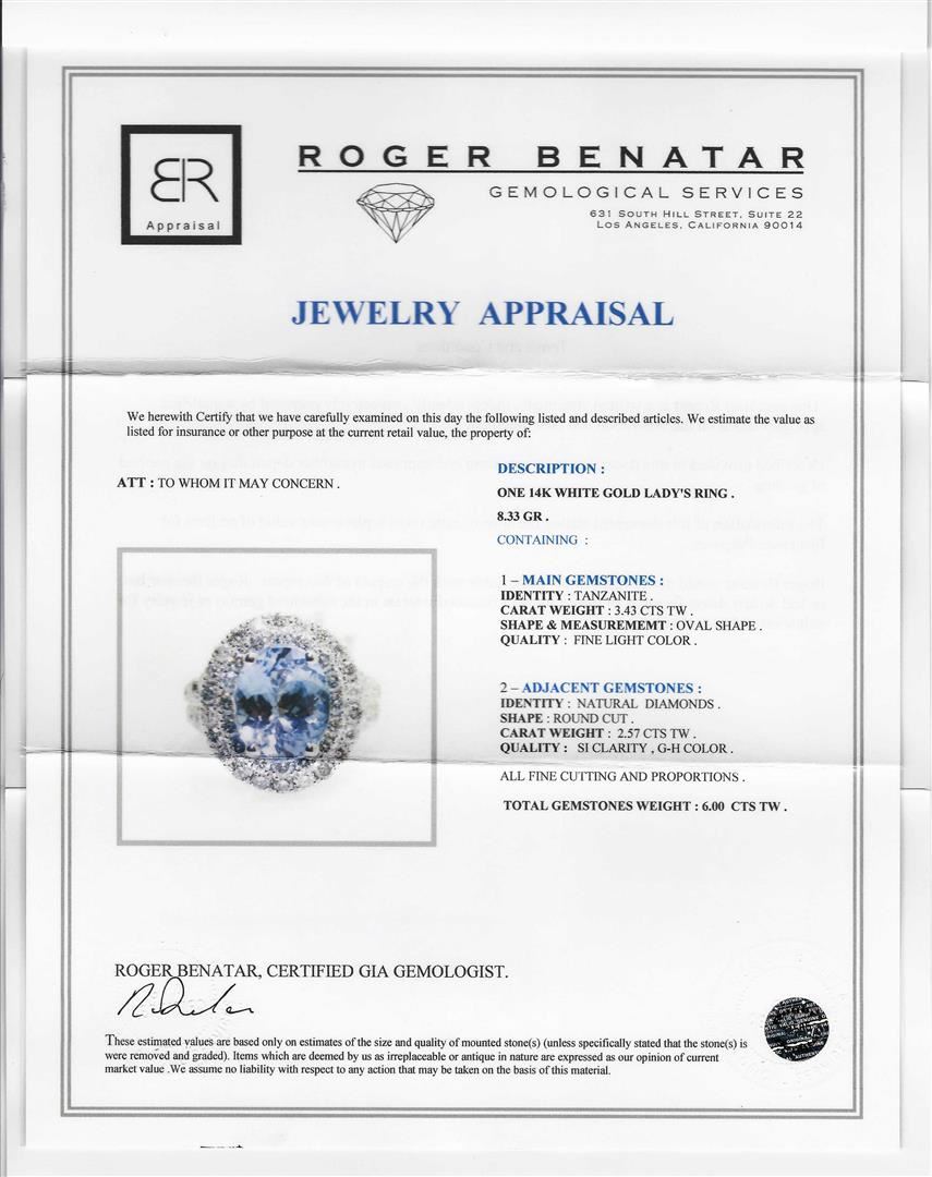 Containing 14K White Gold with a total gross weight of 8.33 grams. (1) Tanzanite Gemstone weighing approximately 3.43 ctw, and surrounded by approximately 2.57ctw of round cut diamonds with SI clarity and G-H Color. RBGS Appraised.