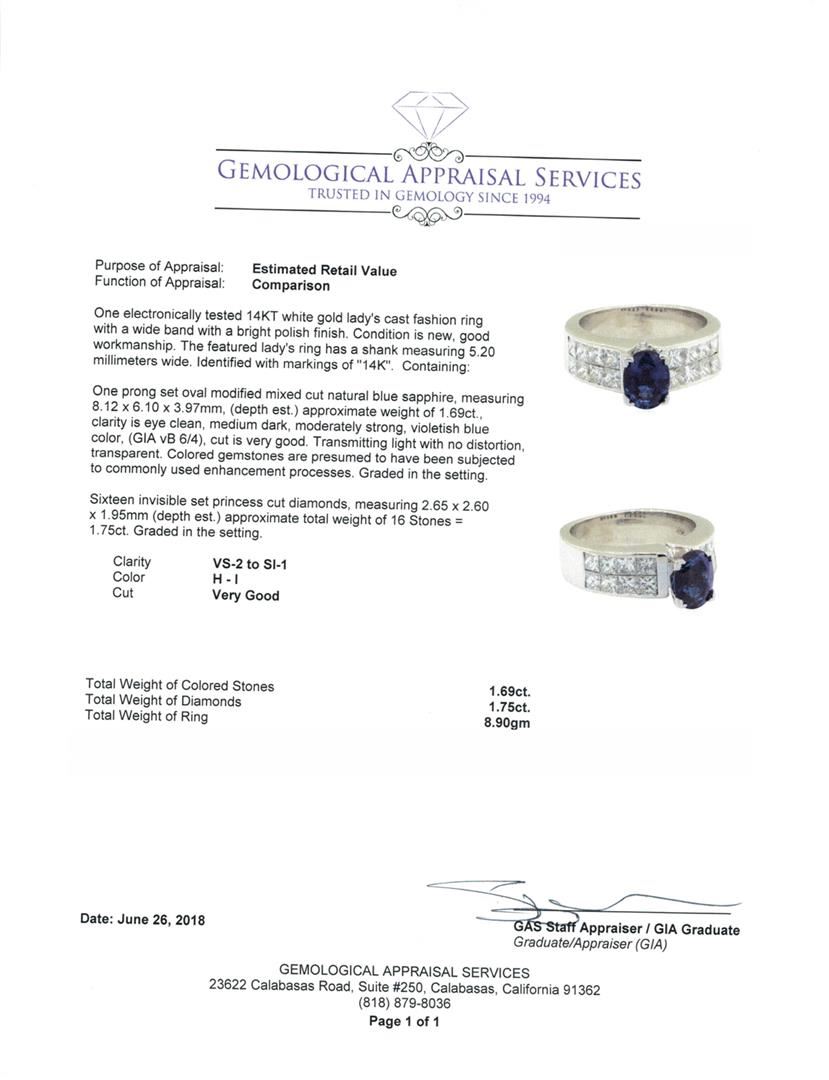 One electronically tested 14KT white gold lady's cast fashion ring with a wide band with a bright polish finish. The featured lady's ring has a shank measuring 5.20 millimeters wide. Identified with markings of '14K'. Condition is new, good workmanship. Containing: One prong set oval modified mixed cut natural blue sapphire, measuring 8.12 x 6.10 x 3.97mm, (depth est.) approximate weight of 1.69ct., clarity is eye clean, medium dark, moderately strong, violetish blue color, (GIA vB 6/4), cut is very good. Transmitting light with no distortion, transparent. Colored gemstones are presumed to have been subjected to commonly used enhancement processes. Graded in the setting. Sixteen invisible set princess cut diamonds, measuring 2.65 x 2.60 x 1.95mm (depth est.) approximate total weight of 16 Stones = 1.75ct. Graded in the setting. Color H - I Clarity VS-2 to SI-1 Cut Very Good. Total Weight of Colored Stones 1.69ct. Total Weight of Diamonds 1.75ct. Total Weight of Ring 8.90gm. GAS Appraised.