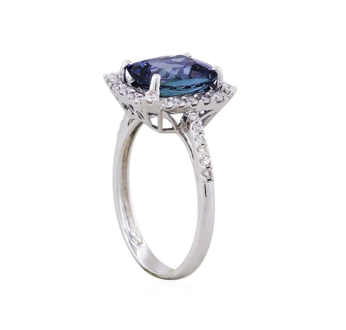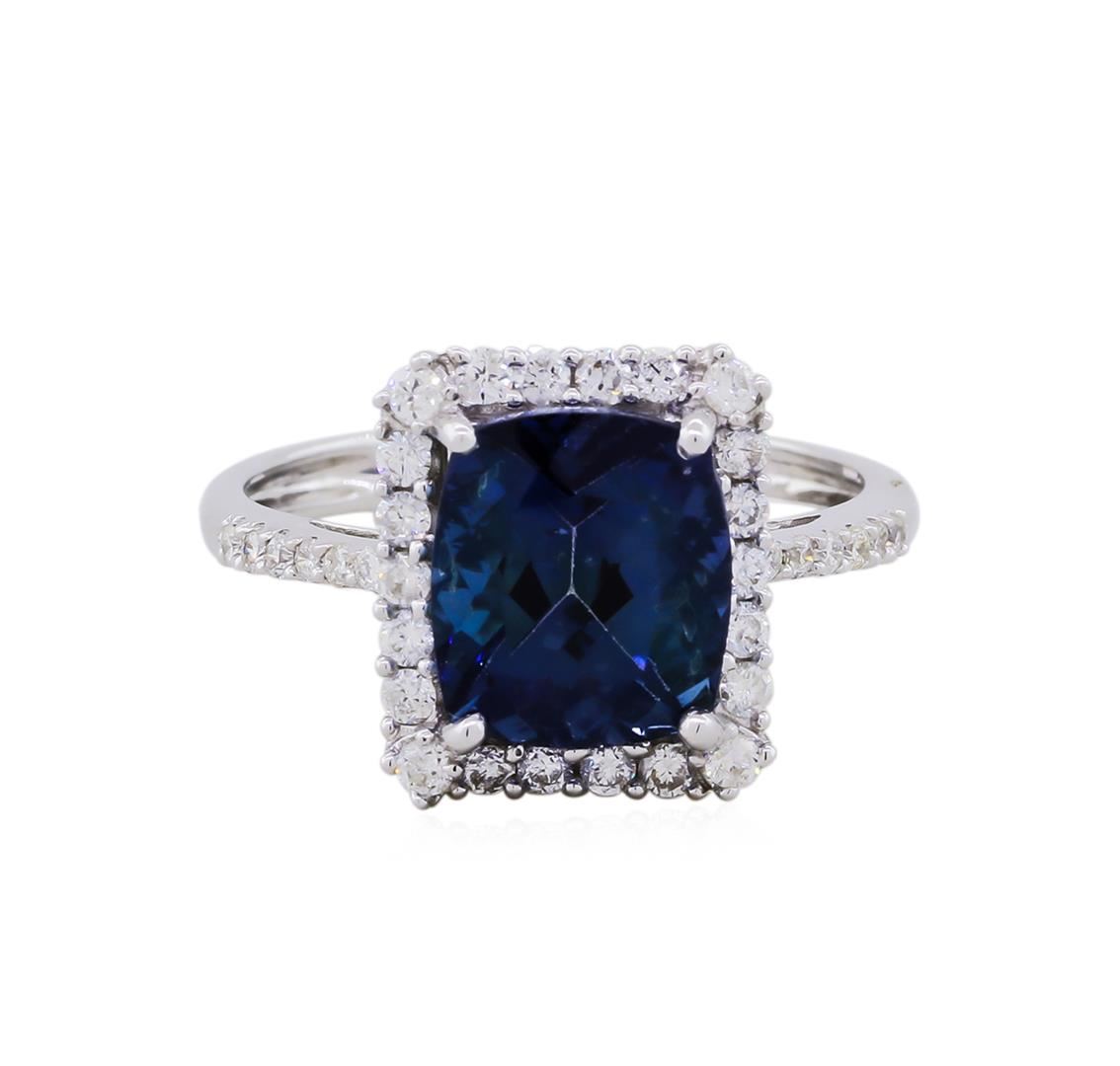 One electronically tested 14KT white gold ladies cast tanzanite and diamond ring with a bright polish finish. The featured tanzanite is set within a diamond bezel supported by diamond set shoulders, completed by a two millimeter wide band. Trademark is Orianne. Identified with markings of "14K". Condition is new, good workmanship. Containing: One prong set rectangular cushion mixed cut natural tanzanite, measuring 9.05 x 7.90 x 5.90mm, approximate weight of 3.48ct., clarity is eye clean, type I, dark, very slightly grayish, violetish blue color, (GIA vB 7/3), cut is good. Natural Tanzanite, color enhanced due to cobalt coating. The presence of the coating prevents determining the stone's actual depth of color. Transmitting light with no distortion, transparent. Grading in the setting. The cobalt coated Tanzanite has a low tolerance to ultrasonic cleaning, and should not be cleaned using this method. Tanzanite is a very rare gemstone that is only found in the country of Tanzania. Originally discovered in 1967. Tiffany & Company, named the stone Tanzanite. It is found in the Usumburu Mountains that border the Umba Valley of northern Tanzania. Tanzanite occurs in gray, brown, violet, blue, reddish-purple, & green. The gem is interesting because of its exceptional pleochroism. Rotated in different directions a tanzanite will exhibit multiple changes of color.Thirty-Four prong set round brilliant cut diamonds, measuring 1.60 - 1.20 x 0.84mm (depth est.) approximate. Total Weight of 34 Stones = 0.45ct. Graded in the setting. Clarity: SI-1 to I-1. Color: H - J. Total Weight of Colored Stones 3.48ct. Total Weight of Diamonds 0.45ct. AIG Appraised at $3,680.00.