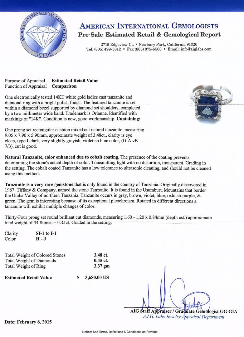 One electronically tested 14KT white gold ladies cast tanzanite and diamond ring with a bright polish finish. The featured tanzanite is set within a diamond bezel supported by diamond set shoulders, completed by a two millimeter wide band. Trademark is Orianne. Identified with markings of "14K". Condition is new, good workmanship. Containing: One prong set rectangular cushion mixed cut natural tanzanite, measuring 9.05 x 7.90 x 5.90mm, approximate weight of 3.48ct., clarity is eye clean, type I, dark, very slightly grayish, violetish blue color, (GIA vB 7/3), cut is good. Natural Tanzanite, color enhanced due to cobalt coating. The presence of the coating prevents determining the stone's actual depth of color. Transmitting light with no distortion, transparent. Grading in the setting. The cobalt coated Tanzanite has a low tolerance to ultrasonic cleaning, and should not be cleaned using this method. Tanzanite is a very rare gemstone that is only found in the country of Tanzania. Originally discovered in 1967. Tiffany & Company, named the stone Tanzanite. It is found in the Usumburu Mountains that border the Umba Valley of northern Tanzania. Tanzanite occurs in gray, brown, violet, blue, reddish-purple, & green. The gem is interesting because of its exceptional pleochroism. Rotated in different directions a tanzanite will exhibit multiple changes of color.Thirty-Four prong set round brilliant cut diamonds, measuring 1.60 - 1.20 x 0.84mm (depth est.) approximate. Total Weight of 34 Stones = 0.45ct. Graded in the setting. Clarity: SI-1 to I-1. Color: H - J. Total Weight of Colored Stones 3.48ct. Total Weight of Diamonds 0.45ct. AIG Appraised at $3,680.00.