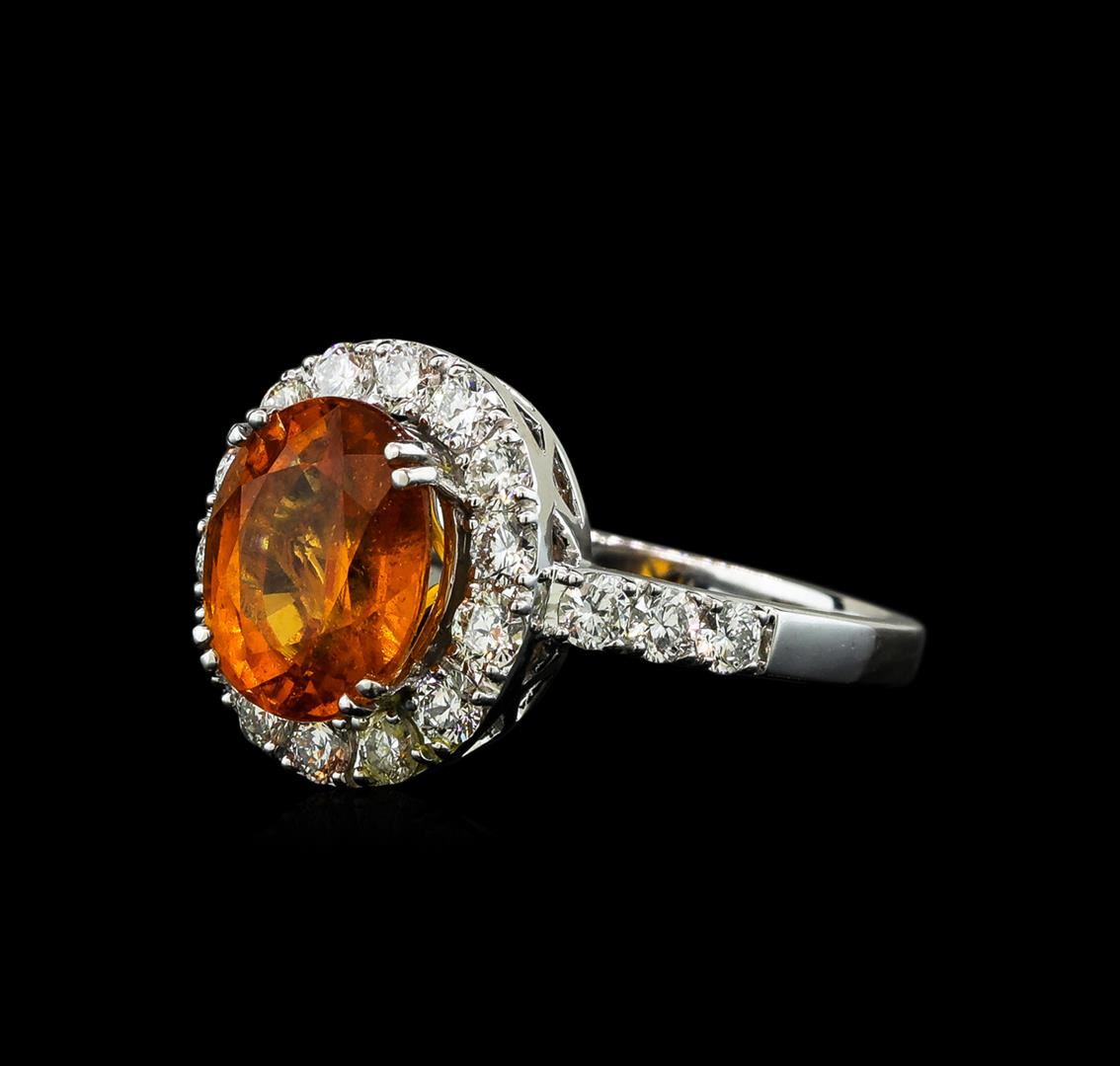 One electronically tested 14KT white gold lady's cast fashion ring with a basket halo with a bright polish finish. The featured lady's ring has a shank measuring 1.80 millimeters wide. Identified with markings of "14K". Condition is new, good workmanship. Containing: One prong set oval modified brilliant cut natural mandarin spessartite, measuring 9.44 x 7.60 x 5.02mm, (depth est.) 10%. bulge factor, approximate weight of 3.50ct., clarity is moderately included, medium, moderately strong, orange color, (GIA O 5/4), cut is good. Transmitting light somewhat diffusely, transparent to translucent. Colored gemstones are presumed to have been subjected to commonly used enhancement processes. Graded in the setting.Twenty prong set round brilliant cut diamonds, measuring 2.25 - 2.15 x 1.36mm (depth est.) approximate total weight of 20 Stones = 0.80ct. Graded in the setting. Clarity: VS-1 to SI-1. Color: G - HCut Very Good. Total Weight of Colored Stones 3.50ct. Total Weight of Diamonds 0.80ct. Total Weight of Ring 4.50gm. GAS Appraised.