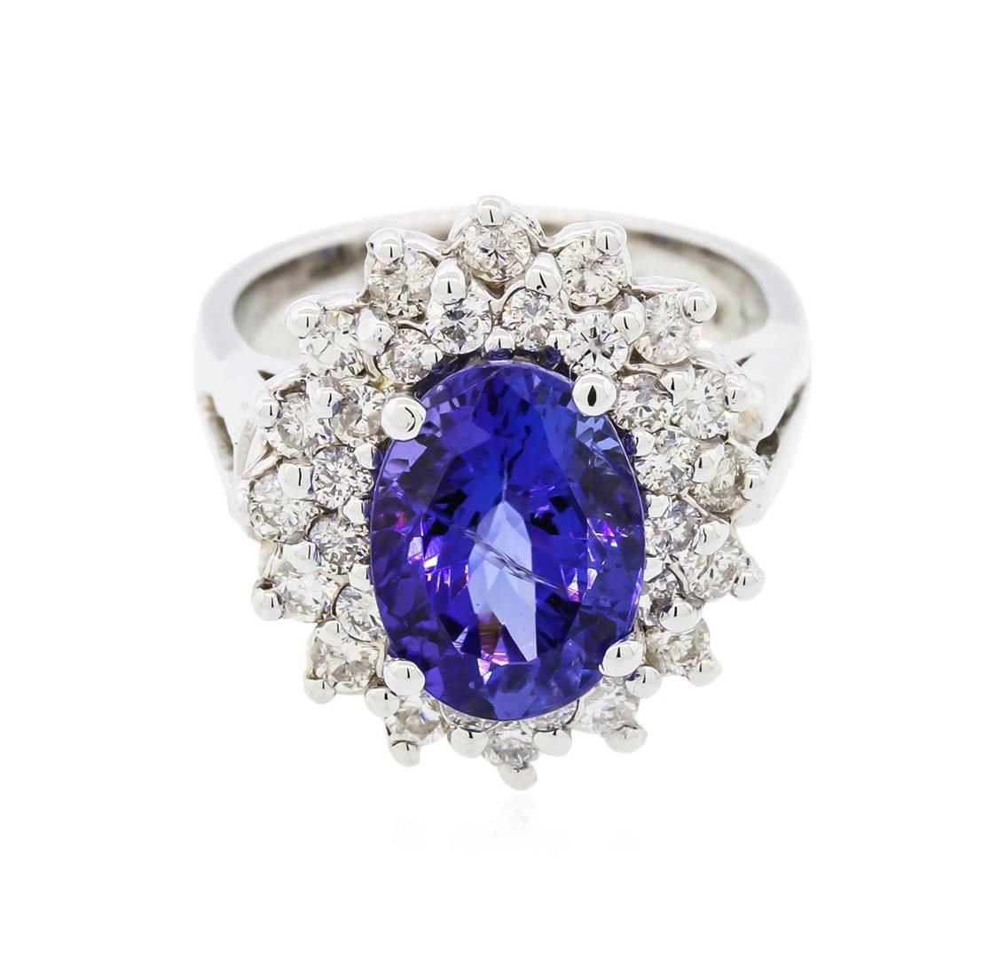 One electronically tested 14KT white gold lady's cast fashion ring with a basket double halo with a bright polish finish. The featured lady's ring has a shank measuring 3.70 millimeters in width. Identified with markings of "14K". Condition is new, good workmanship. Containing: One prong set oval modified brilliant cut natural tanzanite, measuring 10.56 x 7.85 x 6.24mm, approximate weight of 3.50ct., clarity is moderately included, type I, medium dark, moderately strong, violetish blue color, (GIA vB 6/4), cut is very good. Transmitting light with no distortion, transparent. Colored gemstones are presumed to have been subjected to commonly used enhancement processes. Graded in the setting. Thirty-Two prong set round brilliant cut diamonds, measuring 2.00 - 1.90 x 1.21mm (depth est.) approximate total weight of 32 Stones = 0.90ct. Graded in the setting. Clarity: SI-1 to I-1. Color: H - Good. Total Weight of Colored Stones 3.50ct. Total Weight of Diamonds 0.90ct. Total Weight of Ring 8.40gm. GAS Appraised at $8,280.00.
