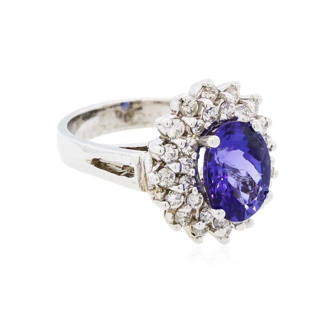One electronically tested 14KT white gold lady's cast fashion ring with a basket double halo with a bright polish finish. The featured lady's ring has a shank measuring 3.70 millimeters in width. Identified with markings of "14K". Condition is new, good workmanship. Containing: One prong set oval modified brilliant cut natural tanzanite, measuring 10.56 x 7.85 x 6.24mm, approximate weight of 3.50ct., clarity is moderately included, type I, medium dark, moderately strong, violetish blue color, (GIA vB 6/4), cut is very good. Transmitting light with no distortion, transparent. Colored gemstones are presumed to have been subjected to commonly used enhancement processes. Graded in the setting. Thirty-Two prong set round brilliant cut diamonds, measuring 2.00 - 1.90 x 1.21mm (depth est.) approximate total weight of 32 Stones = 0.90ct. Graded in the setting. Clarity: SI-1 to I-1. Color: H - Good. Total Weight of Colored Stones 3.50ct. Total Weight of Diamonds 0.90ct. Total Weight of Ring 8.40gm. GAS Appraised at $8,280.00.