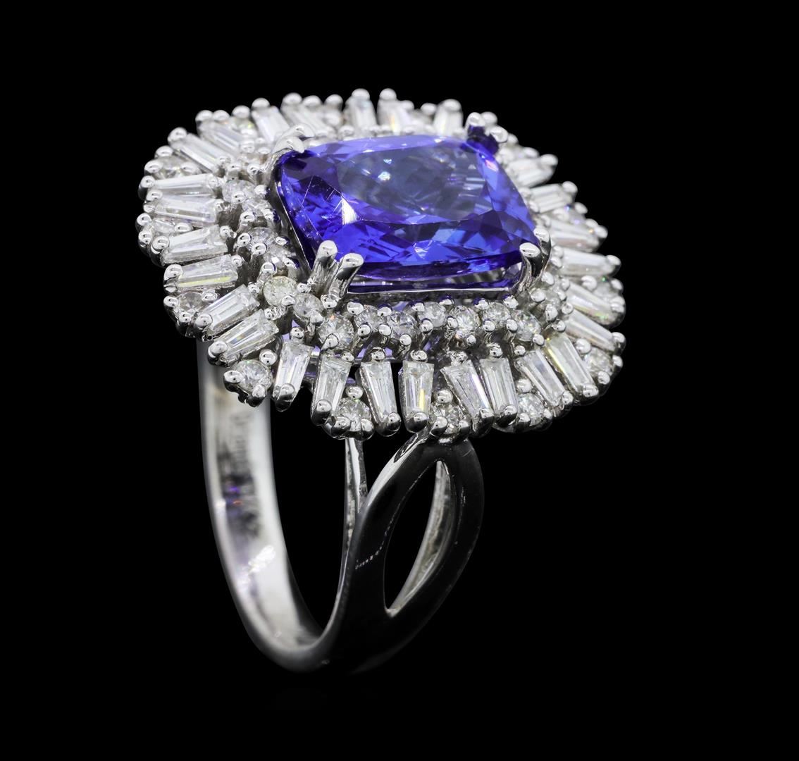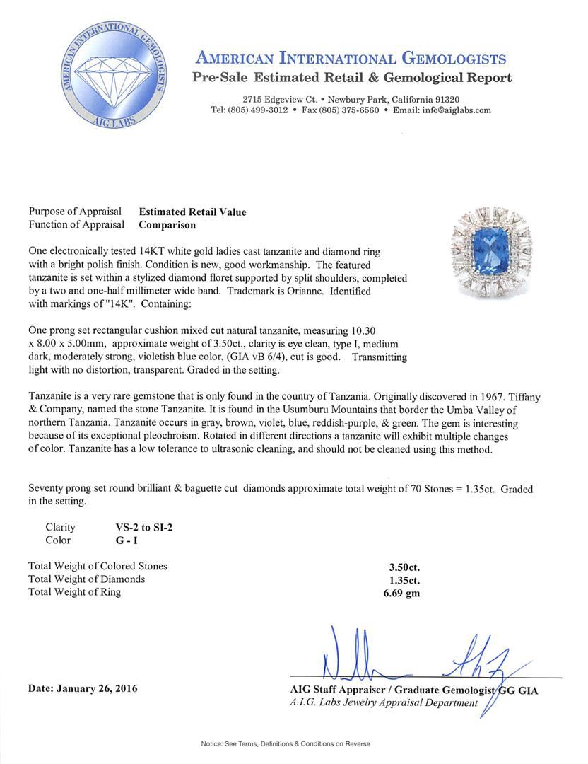 One electronically tested 14KT white gold ladies cast tanzanite and diamond ring with a bright polish finish. The featured tanzanite is set within a stylized diamond floret supported by split shoulders, completed by a two and one-half millimeter wide band. Trademark is Orianne. Identified with markings of "14K". Condition is new, good workmanship. Containing: One prong set rectangular cushion mixed cut natural tanzanite, measuring 10.30 x 8.00 x 5.00mm, approximate weight of 3.50ct., clarity is eye clean, type I, medium dark, moderately strong, violetish blue color, (GIA vB 6/4), cut is good. Transmitting light with no distortion, transparent. Graded in the setting. Tanzanite is a very rare gemstone that is only found in the country of Tanzania. Originally discovered in 1967. Tiffany & Company, named the stone Tanzanite. It is found in the Usumburu Mountains that border the Umba Valley of northern Tanzania. Tanzanite occurs in gray, brown, violet, blue, reddish-purple, & green. The gem is interesting because of its exceptional pleochroism. Rotated in different directions a tanzanite will exhibit multiple changes of color. Tanzanite has a low tolerance to ultrasonic cleaning, and should not be cleaned using this method. Seventy prong set round brilliant & baguette cut diamonds approximate total weight of 70 Stones = 1.35ct. Graded in the setting. Clarity: VS-2 to SI-2. Color: G - I. Total Weight of Colored Stones 3.50ct. Total Weight of Diamonds 1.35ct. Total Weight of Ring 6.69gm. AIG Appraised.