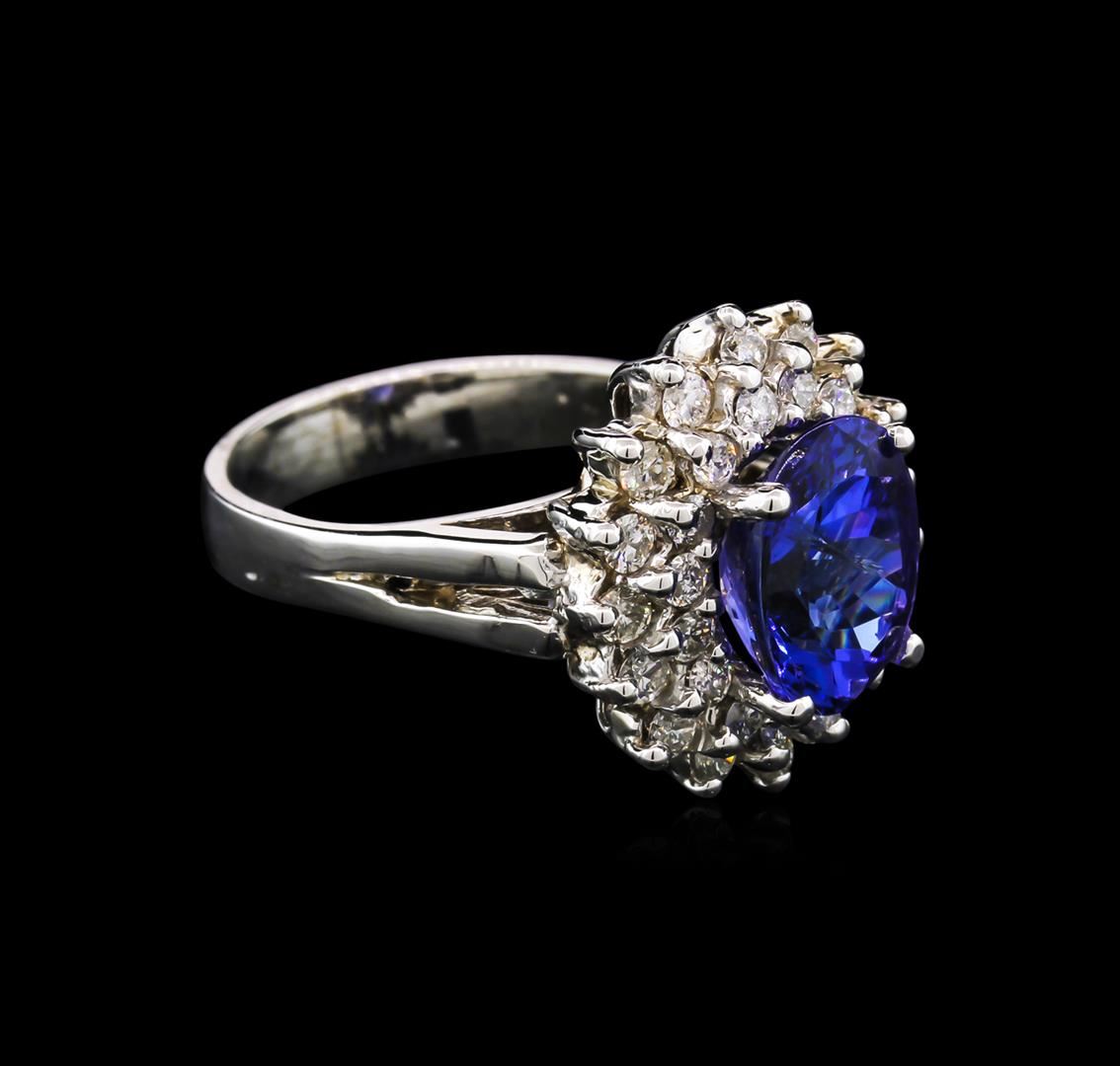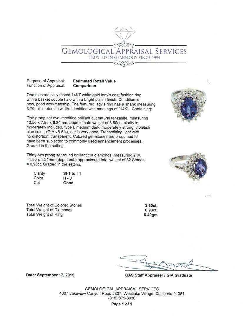 One electronically tested 14KT white gold lady's cast fashion ring with a basket double halo with a bright polish finish. The featured lady's ring has a shank measuring 3.70 millimeters in width. Identified with markings of "14K". Condition is new, good workmanship. Containing: One prong set oval modified brilliant cut natural tanzanite, measuring 10.56 x 7.85 x 6.24mm, approximate weight of 3.50ct., clarity is moderately included, type I, medium dark, moderately strong, violetish blue color, (GIA vB 6/4), cut is very good. Transmitting light with no distortion, transparent. Colored gemstones are presumed to have been subjected to commonly used enhancement processes. Graded in the setting. Thirty-Two prong set round brilliant cut diamonds, measuring 2.00 - 1.90 x 1.21mm (depth est.) approximate total weight of 32 Stones = 0.90ct. Graded in the setting. Clarity: SI-1 to I-1. Color: H - Good. Total Weight of Colored Stones 3.50ct. Total Weight of Diamonds 0.90ct. Total Weight of Ring 8.40gm. GAS Appraised.