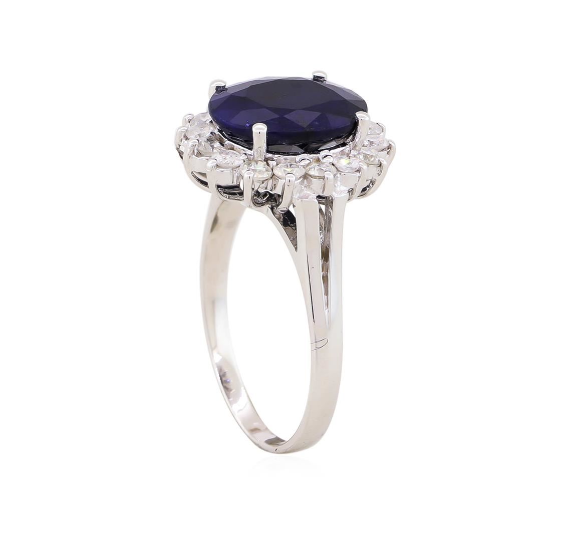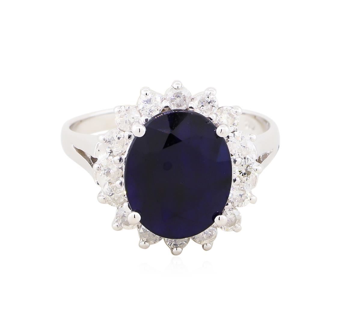 Fourteen Karat (14K) White Gold Sapphire And Diamond Ring. An Oval Cut Sapphire Corundum Gemstone Is Prong Mounted In The Center Of The Ring. Round Brilliant Cut Diamonds Accent The Ring Around The Center Gemstone. The Ring Is Cast Stamped "14K" And Has A Gross Weight Of 3.8 Grams. Diamonds: Shape: Round Brilliant Cut, Weight: 0.59 Carat, Average Clarity: I1-I2, Average Color: H-J, Symmetry: Very Good, Polish: Very Good. Gemstone: Sapphire Corundum. Nature: Natural, Shape: Oval, Faceted, Quantity: 1 Mounted, Weight: 3.54 Carat, Center Stone Dimensions: Length-10.48 Mm.; Width-8.62 Mm., Bulge: Visible, Clarity: Si, Type 3, Color: Blue (5/5), Symmetry: Very Good, Color Intensity: Medium, Transparency: Transparent, Tone: Dark. Comments: Indications Of High Temperature And Diffusion. Metal: Gold, Stamped. Purity: 14K, Color: White, Condition: Excellent, Finish: High Polish. GGA Appraised.