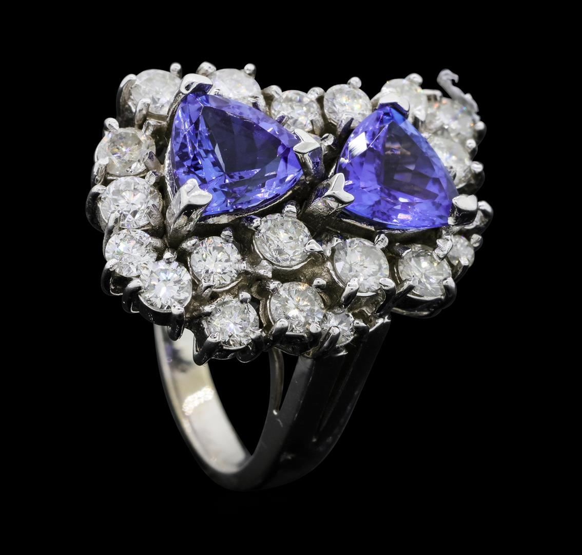 One electronically tested 14KT white gold ladies cast tanzanite and diamond ring. The featured tanzanite is set within a two tier diamond gallery, completed by diamond set split shoulders completed by a three millimeter wide band. Bright polish finish, with milgrain detailing throughout. Identified with markings of "14K". Condition is new, good workmanship. Containing: One prong set square cushion mixed cut natural tanzanite, measuring 6.45 x 6.40 x 4.18mm, approximate weight of 1.54ct., clarity is slightly included, type I, medium dark, moderately strong, violetish blue color, (GIA vB 6/4) to medium dark, moderately strong, bluish violet, (GIA bV 6/4), cut is good. Transmitting light with no distortion, transparent. Graded in the setting. Tanzanite is a very rare gemstone that is only found in the country of Tanzania. Tanzanite was originally discovered in 1967. Tiffany & Company, named the stone "Tanzanite" after the country of origin. Tanzanite is found in the Usumburu Mountains that border the Umba Valley of northern Tanzania. This region is inhabited by the Masai tribes-people. The mining area is located just south of the Kenya border near Mt. Kilimanjaro. Tanzanite occurs in colors of gray, brown, violet, blue, reddish-purple, & green. The gem is interesting because of its exceptional pleochroism. Rotated in different directions a tanzanite will exhibit multiple changes of color. Tanzanite has a low tolerance to ultrasonic cleaning, and should not be cleaned using this method. One Hundred Twelve prong & bead set round brilliant cut diamonds, measuring 1.55 - 1.00 x 0.77mm (depth est.) approximate total weight of 112 Stones = 1.20ct. Graded in the setting. Clarity: SI-2 to I-2. Color: F - H. Total Weight of Colored Stones 1.54ct. Total Weight of Diamonds 1.20ct. Total Weight of Ring 11.50gm. AIG Appraised.