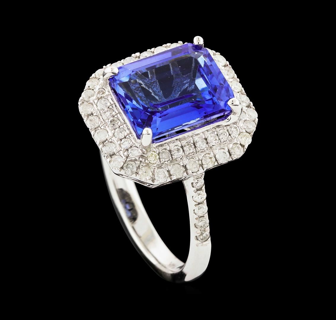 One electronically tested 14KT white gold ladies cast blue star sapphire and diamond ring with a bright polish finish. The featured blue star sapphire is set within two tiered diamond bezels, completed by a two millimeter wide band. Identified with markings of "K14". Condition is new, good workmanship. Containing: One prong set oval cabochon cut natural blue star sapphire, measuring 14.50 x 11.80 x 4.05mm, 10%. bulge factor, approximate weight of 8.24ct., dark, very slightly grayish, violetish blue color, (GIA vB 7/3), cut is good. This stone has a mostly complete six ray star with strong intensity and good movement. Transmitting light very diffusely, opaque. Naturally occurring internal & external characteristics are present. Indications of multiple laboratory enhancements, including high temperature diffusion treatment. Graded in the setting. Forty-Four prong set round brilliant cut diamonds approximate total weight of 44 Stones = 1.57ct. Graded in the setting. Clarity: I-1 to I-3. Color: H - J. Total Weight of Colored Stones 8.24ct. Total Weight of Diamonds 1.57ct. Total Weight of Ring 8.14gm. AIG Appraised at $11,395.00.