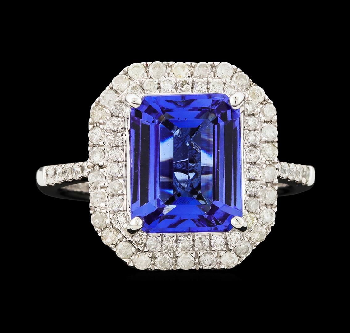 One electronically tested 14KT white gold ladies cast tanzanite and diamond ring with a bright polish finish. The featured tanzanite is set within two tiered diamond bezels supported by diamond set shoulders, completed by a two and one-half millimeter wide band. Trademark is Orianne. Identified with markings of "14K". Condition is new, good workmanship. Containing: One prong set rectangular step cut natural tanzanite, measuring 10.10 x 8.10 x 4.60mm, approximate weight of 3.65ct., clarity is eye clean, type I, medium dark, very slightly grayish, violetish blue color, (GIA vB 6/3), cut is good. Transmitting light with no distortion, transparent. Graded in the setting. Tanzanite is a very rare gemstone that is only found in the country of Tanzania. Originally discovered in 1967. Tiffany & Company, named the stone Tanzanite. It is found in the Usumburu Mountains that border the Umba Valley of northern Tanzania. Tanzanite occurs in gray, brown, violet, blue, reddish-purple, & green. The gem is interesting because of its exceptional pleochroism. Rotated in different directions a tanzanite will exhibit multiple changes of color. Tanzanite has a low tolerance to ultrasonic cleaning, and should not be cleaned using this method. Seventy prong set round brilliant cut diamonds, measuring 1.40 - 1.10 x 0.75mm (depth est.) approximate total weight of 70 Stones = 0.53ct. Graded in the setting. Clarity: I-1 to I-3. Color: H - J. Total Weight of Colored Stones 3.65ct. Total Weight of Diamonds 0.53ct. Total Weight of Ring 4.80gm. AIG Appraised.