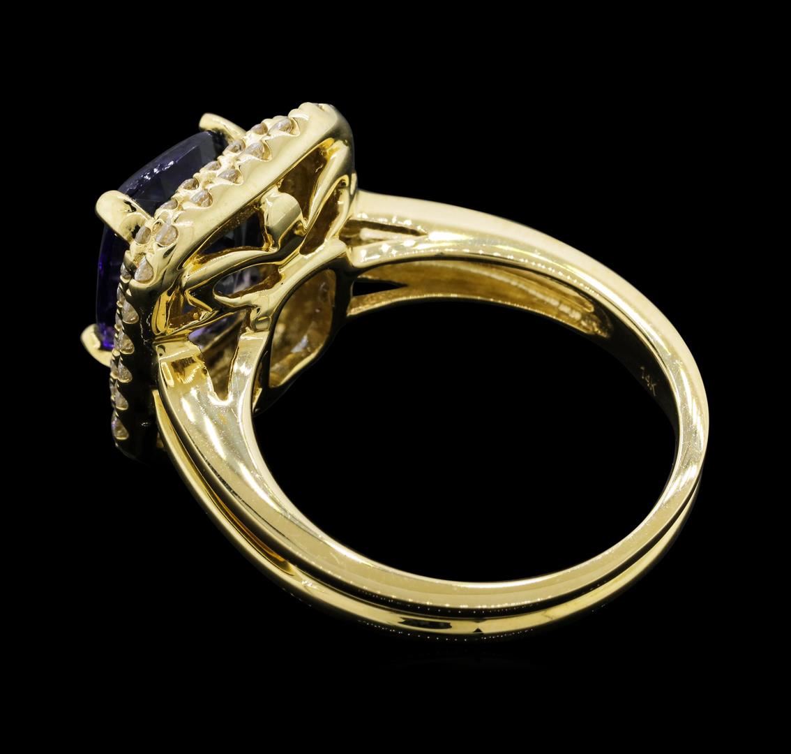 One electronically tested 14KT yellow gold ladies cast tanzanite and diamond ring with a bright polish finish. The featured tanzanite is set within tiered diamond bezels supported by a lattice under gallery and split shoulders, completed by a two millimeter wide band. Trademark is Orianne. Identified with markings of "14K". Condition is new, good workmanship. Containing: One prong set rectangular cushion mixed cut natural tanzanite, measuring 10.00 x 7.80 x 5.20mm, 10%. bulge factor, approximate weight of 3.66ct., clarity is eye clean, type I, medium dark, very slightly grayish, violetish blue color, (GIA vB 6/3), cut is good. Transmitting light with no distortion, transparent. Graded in the setting. Tanzanite is a very rare gemstone that is only found in the country of Tanzania. Originally discovered in 1967. Tiffany & Company, named the stone Tanzanite. It is found in the Usumburu Mountains that border the Umba Valley of northern Tanzania. Tanzanite occurs in gray, brown, violet, blue, reddish-purple, & green. The gem is interesting because of its exceptional pleochroism. Rotated in different directions a tanzanite will exhibit multiple changes of color. Tanzanite has a low tolerance to ultrasonic cleaning, and should not be cleaned using this method. Fifty-Two prong set round brilliant cut diamonds approximate total weight of 52 Stones = 0.58ct. Graded in the setting. Clarity: SI-2 to I-2. Color: G - I. Total Weight of Colored Stones 3.66ct. Total Weight of Diamonds 0.58ct. Total Weight of Ring 6.44gm. AIG Appraised.