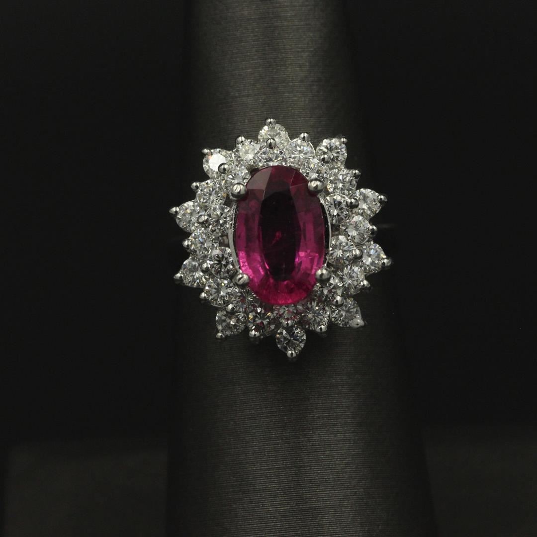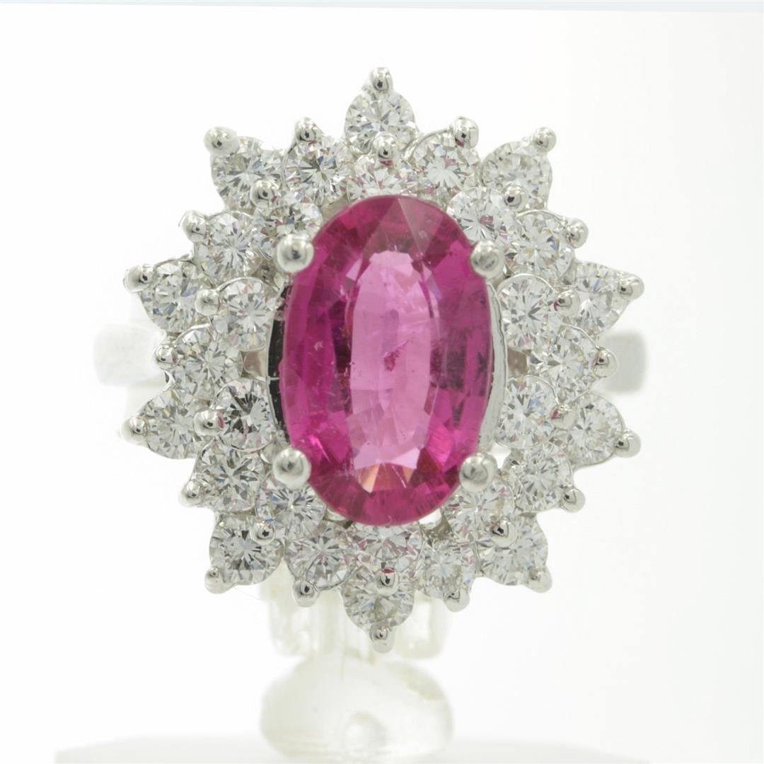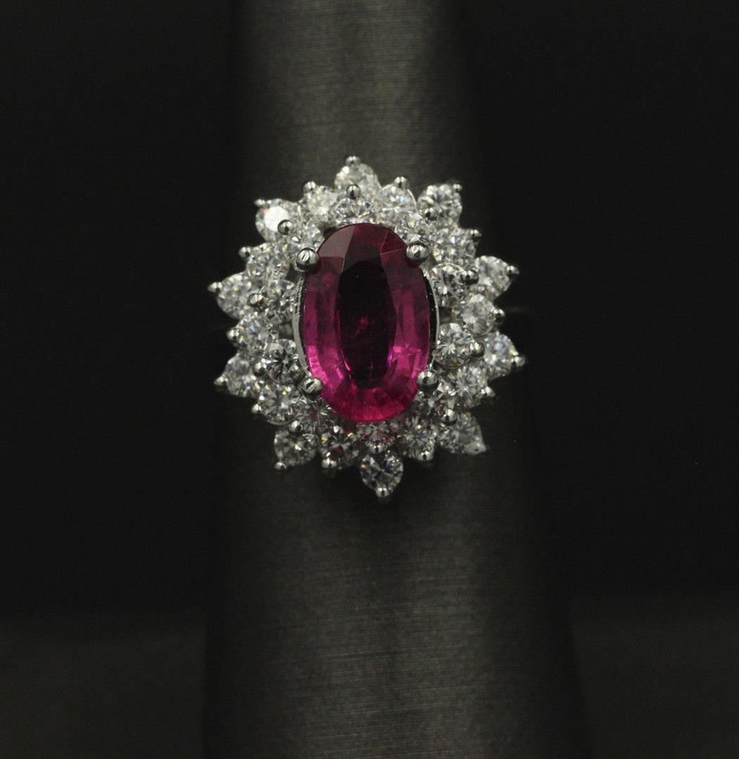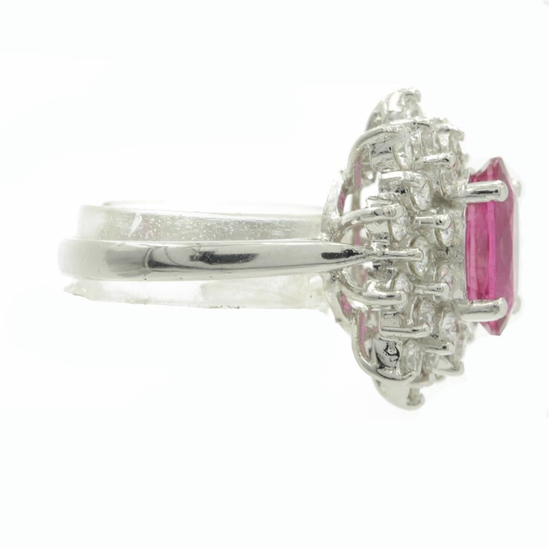 One Round Cut Rubellite Diamonds Oval Cut Flower Ring in 14K White Gold. Total stone weight is 2.15 carats. Size 6.75 can be resized. Setting style is engagement with accent. Gross weight totals 6.15 grams with a total of 31 stones. Condition is brand new. Main stone is non enhanced / natural - straight from mother earth. Main diamond weight is 2.15 carats with oval shape, fine deep color, and excellent cut. Side stone is natural and non-enhanced with a total stone weight of 1.51 carats. Side diamond shape is brilliant round cut with VS 1 clarity, G-H color, fine cut, with a total of 30 diamonds.