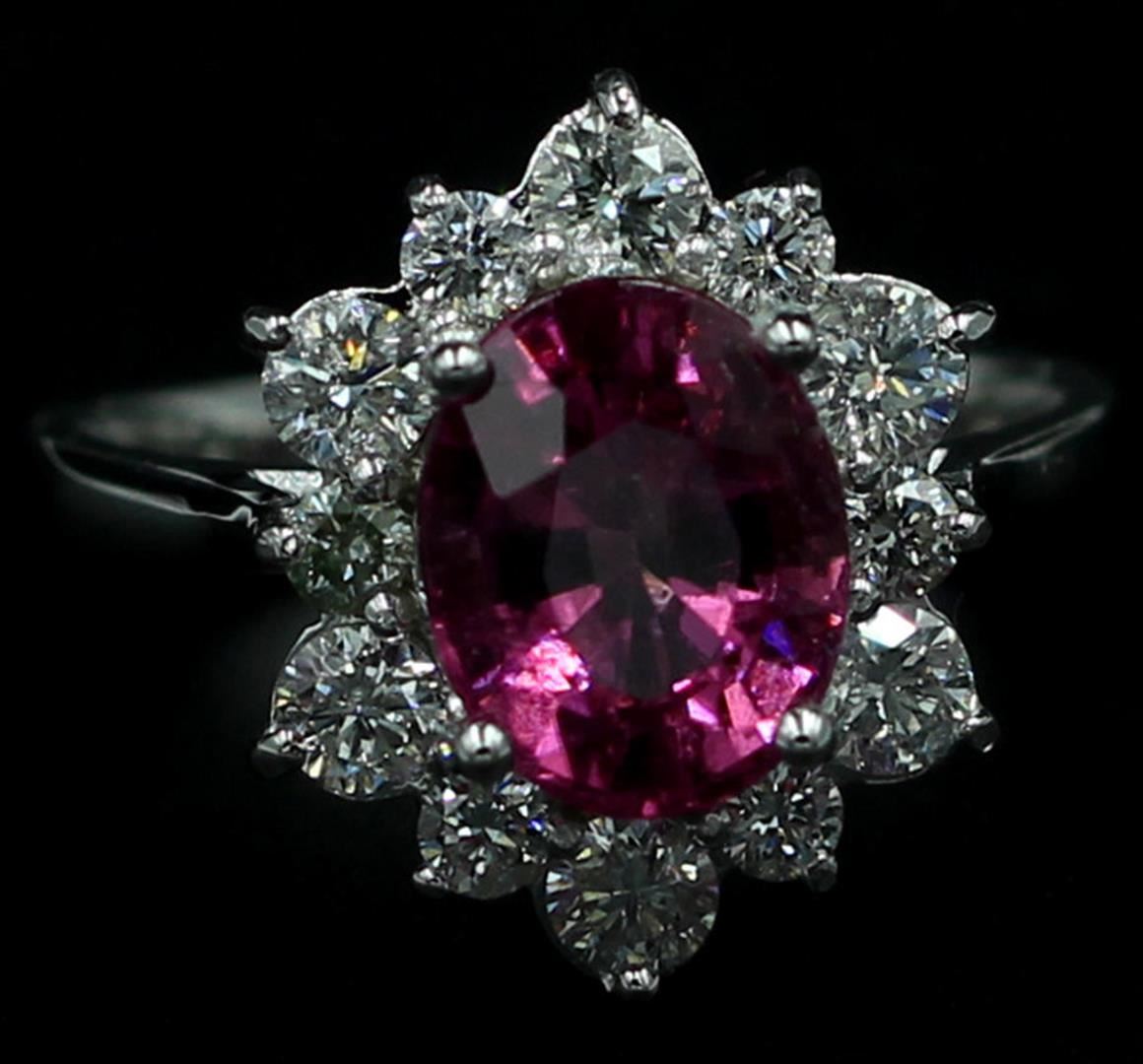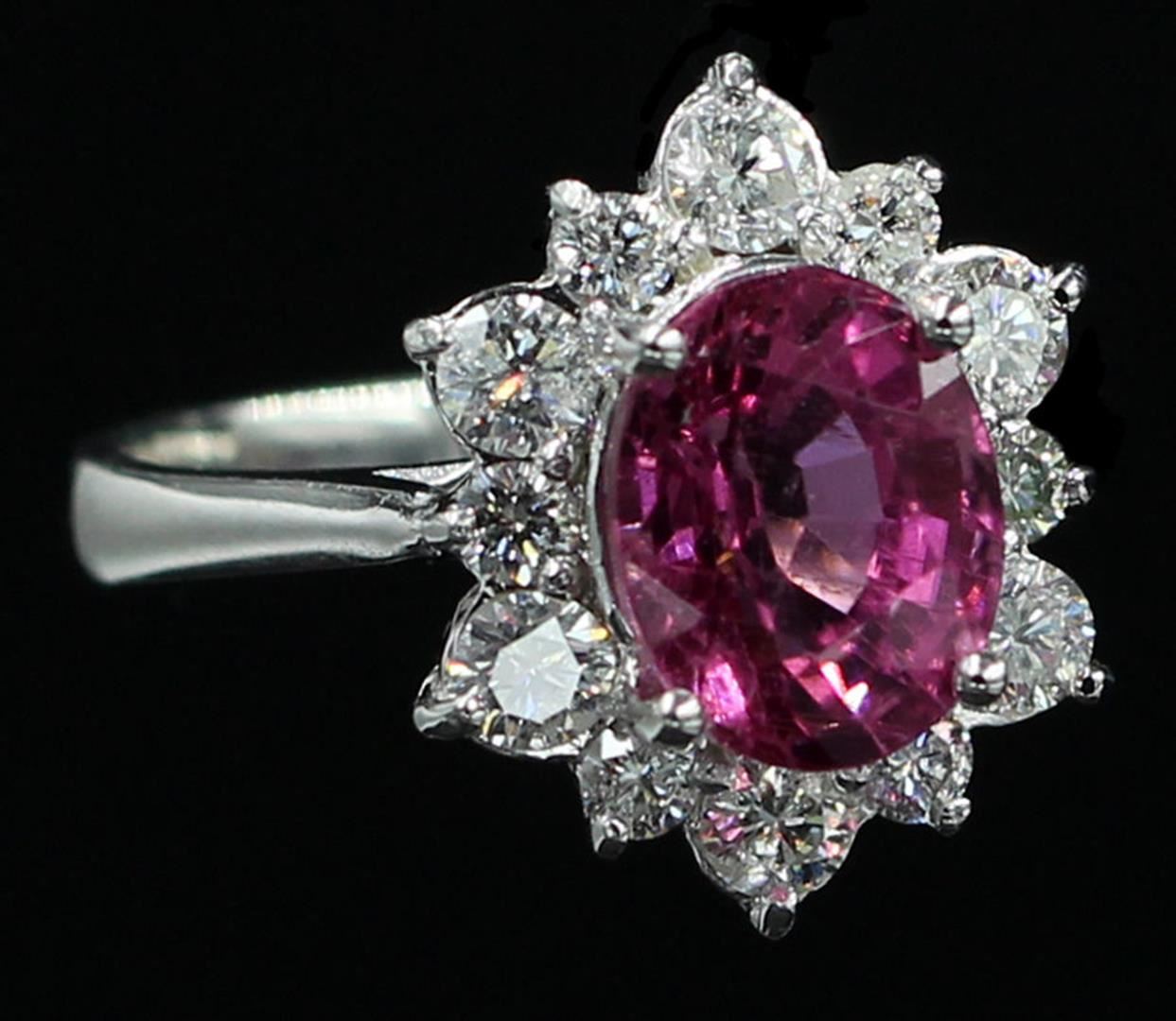 One Oval Cut Pink Tourmaline Halo Diamond Band Ring in 14k White Gold. Total carat weight is 3.70 Ct. Size 6.50 but resizable. Setting style is 4 prong with accent diamonds. Gross gold is 4.67 grams. Total stones: 13. Condition is brand new. Main stone is natural and non-enhanced. Main diamond carat weight is 2.82 Ct, shape oval brilliant, clarity is fine, color natural pink tourmaline, and cut is excellent. Side stone is natural and non-enhanced. Total carats is 0.88, shape is round brilliant cut, clarity is SI, color is G, and cut is excellent. Number of side diamonds is 12.