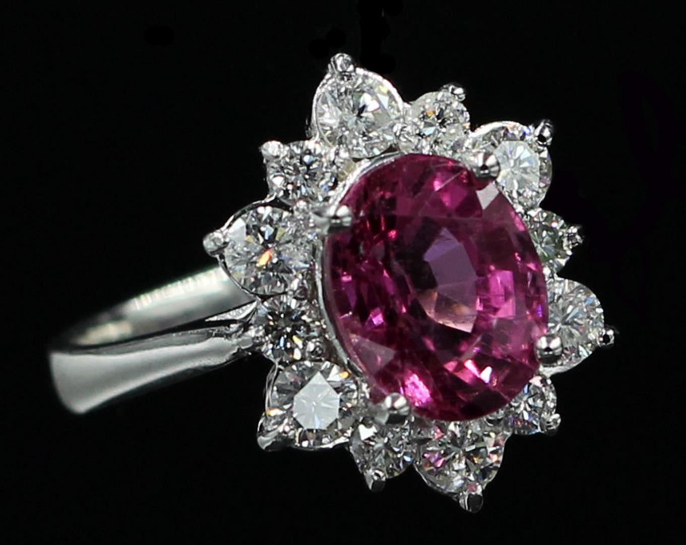 One Oval Cut Pink Tourmaline Halo Diamond Band Ring in 14k White Gold. Total carat weight is 3.70 Ct. Size 6.50 but resizable. Setting style is 4 prong with accent diamonds. Gross gold is 4.67 grams. Total stones: 13. Condition is brand new. Main stone is natural and non-enhanced. Main diamond carat weight is 2.82 Ct, shape oval brilliant, clarity is fine, color natural pink tourmaline, and cut is excellent. Side stone is natural and non-enhanced. Total carats is 0.88, shape is round brilliant cut, clarity is SI, color is G, and cut is excellent. Number of side diamonds is 12.