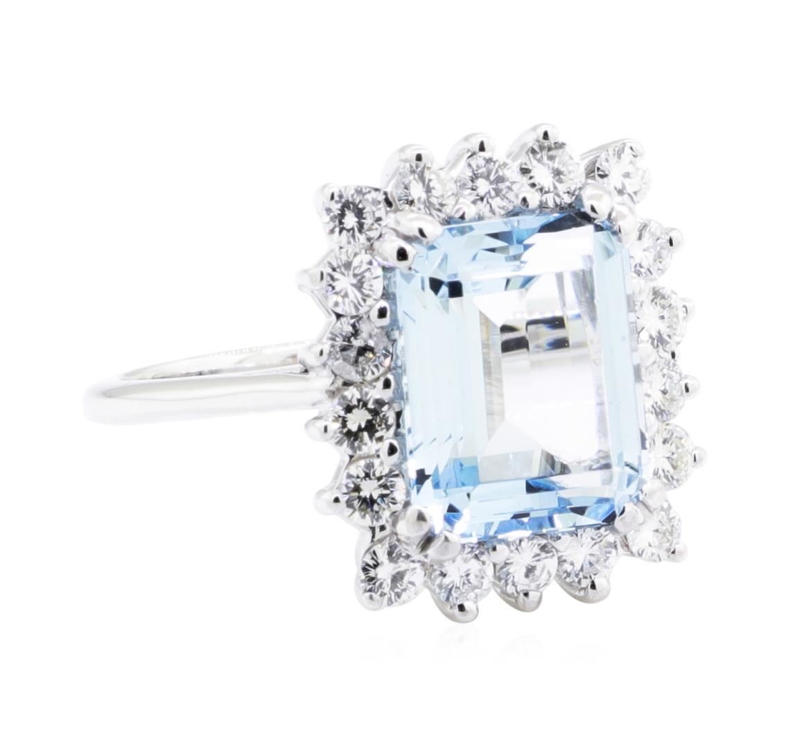 One electronically tested 14KT white gold lady's cast fashion ring with a basket halo with a bright polish finish. The featured lady's ring has a shank measuring 1.61 millimeters wide. Identified with markings of '18K'. Condition is new, good workmanship. Containing: One prong set emerald standard step cut natural aquamarine, measuring 10.03 x 8.04 x 5.12mm, (depth est.) 5%. bulge factor, approximate weight of 3.20ct., clarity is eye clean, light, very slightly grayish, very slightly greenish blue color, (GIA vslgB 3/3), cut is very good. Transmitting light with no distortion, transparent. Colored gemstones are presumed to have been subjected to commonly used enhancement processes. Graded in the setting. Eighteen prong set round brilliant cut diamonds, measuring 2.10 - 2.00 x 1.27mm (depth est.) approximate total weight of 18 Stones = 0.60ct. Graded in the setting. Color G - H Clarity VS-2 to SI-1 Cut Very Good. Total Weight of Colored Stones 3.20ct. Total Weight of Diamonds 0.60ct. Total Weight of Ring 4.80gm. GAS Appraised.