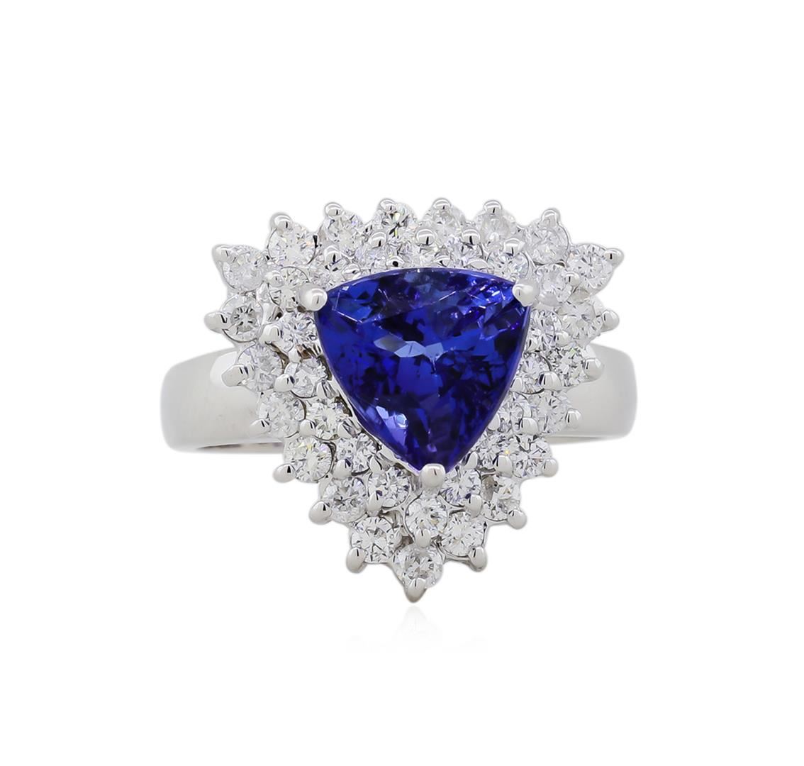 One polished, stamped and tested 14KT white gold ring mounted with: 1 genuine tanzanite center stone weighing 3.85 carats, and 39 genuine diamonds weighing 1.03 carats. The centerstone is triangular shape with a modified brilliant cut, meausring 9 x 9mm. Color is violetish blue. Clarity of 39 diamonds range from VS2-SI2. This item weighs 7.9 grams, condition is new and workmanship is excellent. AIGL Appraised at $14,987.00.
