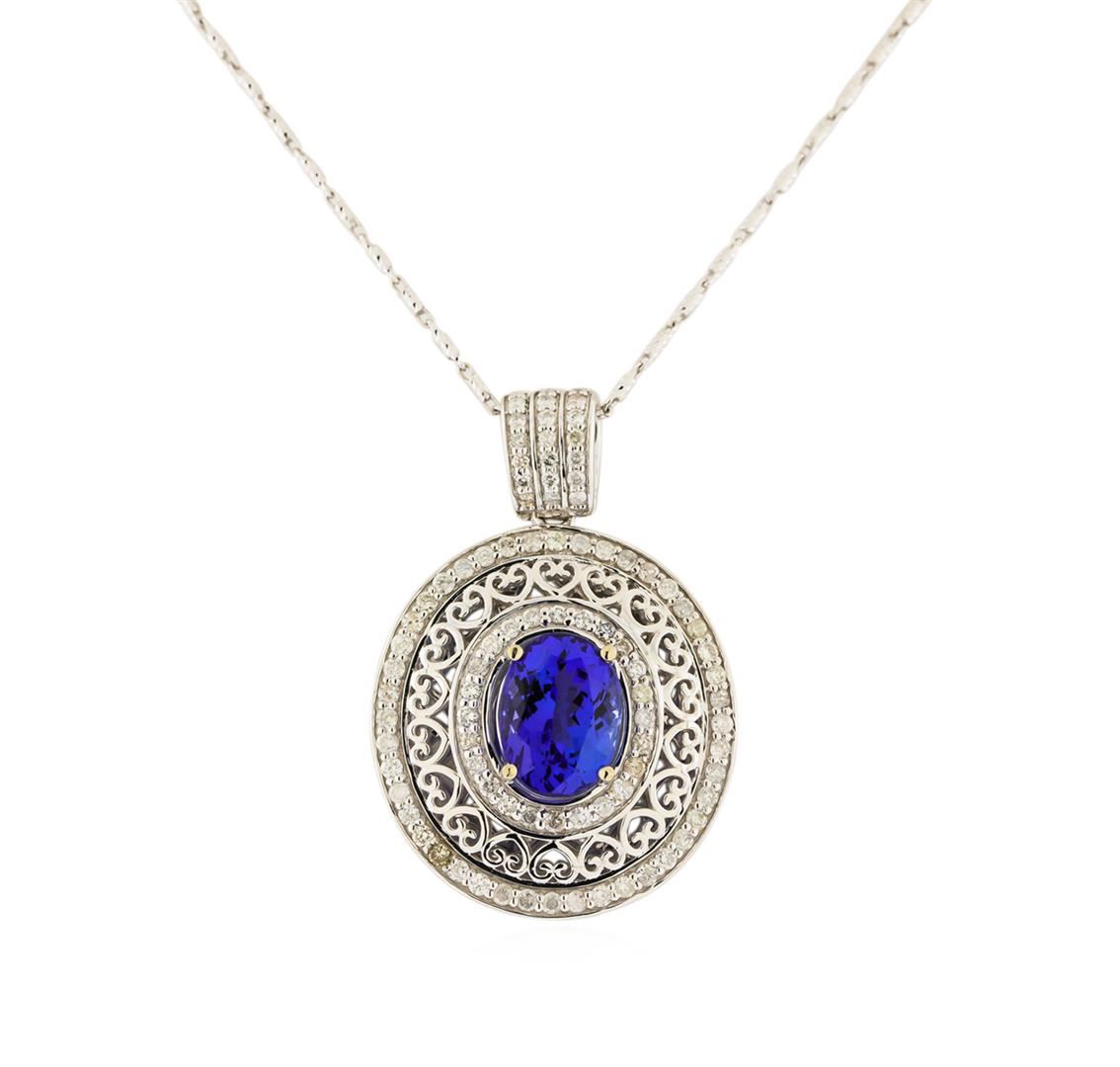 One electronically tested 14KT white gold ladies cast & assembled tanzanite and diamond pendant with chain. The pendant features a tanzanite set within concentric diamond bezels with filligree lattice detailing, completed by a diamond set bail. The pendant is completed by an eighteen inch length 14KT white gold designer style chain, terminating in a lobster claw clasp. Bright polish finish. Trademark is Orianne. Identified with markings of "14K". Condition is new, good workmanship. Containing: One prong set oval mixed cut natural tanzanite, measuring 10.70 x 8.00 x 6.00mm, approximate weight of 3.88ct., clarity is eye clean, type I, medium dark, very slightly grayish, violetish blue color, (GIA vB 6/3), cut is good. Transmitting light with no distortion, transparent. Graded in the setting.Tanzanite is a very rare gemstone that is only found in the country of Tanzania. Originally discovered in 1967. Tiffany & Company, named the stone Tanzanite. It is found in the Usumburu Mountains that border the Umba Valley of northern Tanzania. Tanzanite occurs in gray, brown, violet, blue, reddish-purple, & green. The gem is interesting because of its exceptional pleochroism. Rotated in different directions a tanzanite will exhibit multiple changes of color. Tanzanite has a low tolerance to ultrasonic cleaning, and should not be cleaned using this method.Ninety-Nine prong set round brilliant cut diamonds approximate total weight of 99 Stones = 1.07ct. Color grade is an average for the group. Graded in the setting. Clarity: I-1 to I-2. Color: G - I. Total Weight of Colored Stones 3.88ct. Total Weight of Diamonds 1.07ct. Total Weight of Pendant With Chain 10.53gm. AIG Appraised at $12,820.00.