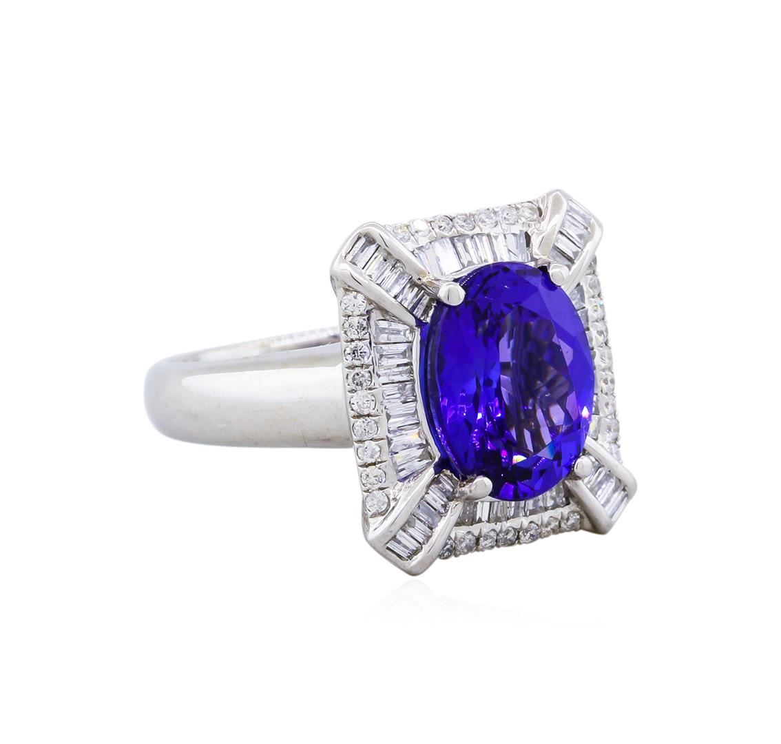Beautiful tanzanite and diamond ring set in 14KT white gold weighing 7.50 grams containing a 3.89 carat oval shaped tanzanite center stone intricately framed by eighty baguette and round diamonds with a total weight of 0.65cts.