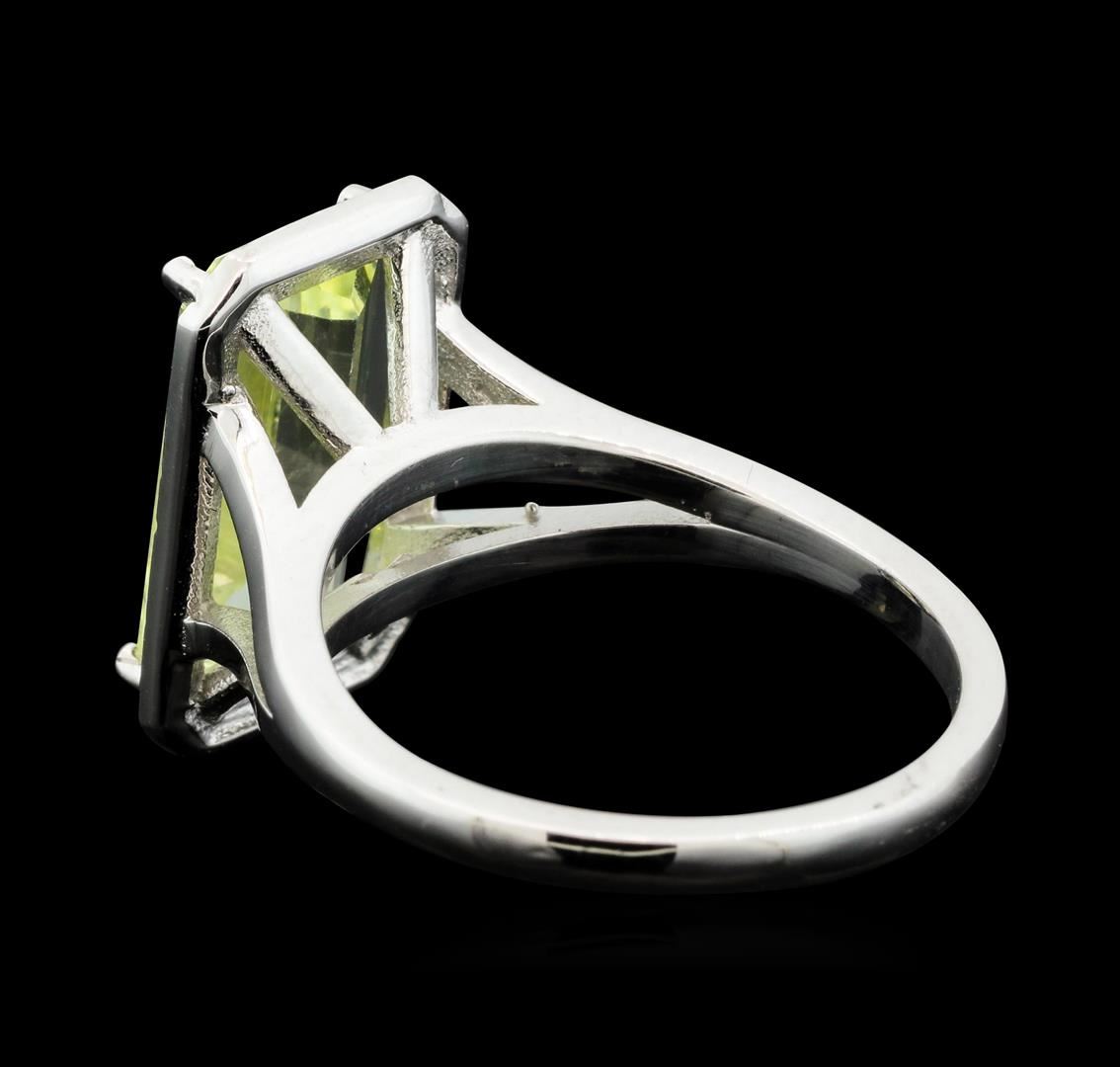 One lady's ring featuring: 14KT white gold weighing 4.6 grams containing one center green quartz weighing 3.90ct and twenty-eight diamonds weighing 0.25ctw.