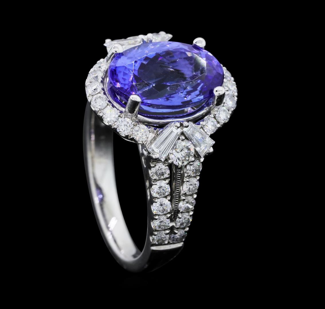 One electronically tested 18KT white gold ladies cast tanzanite and diamond ring. The featured tanzanite is set within a diamond bezel supported by stylized diamond set split shoulders, completed by a two millimeter wide band. Trademark is UCG. Identified with markings of "18K 750". Condition is new, good workmanship. Containing: One prong set oval mixed cut natural tanzanite, measuring 11.70 x 7.80 x 5.70mm, approximate weight of 3.94ct., clarity is eye clean, type I, medium dark, moderately strong, bluish violet color, (GIA bV 6/4), cut is good. Transmitting light with no distortion, transparent. Graded in the setting. Tanzanite is a very rare gemstone that is only found in the country of Tanzania. Originally discovered in 1967. Tiffany & Company, named the stone Tanzanite. It is found in the Usumburu Mountains that border the Umba Valley of northern Tanzania. Tanzanite occurs in gray, brown, violet, blue, reddish-purple, & green. The gem is interesting because of its exceptional pleochroism. Rotated in different directions a tanzanite will exhibit multiple changes of color. Tanzanite has a low tolerance to ultrasonic cleaning, and should not be cleaned using this method. Forty-Two prong set round brilliant & baguette cut diamonds approximate total weight of 42 Stones = 1.13ct. Graded in the setting. Clarity: VS-2 to SI-2. Color: F - H. Total Weight of Colored Stones 3.94ct. Total Weight of Diamonds 1.13ct. Total Weight of Ring 6.33gm. AIG Appraised.
