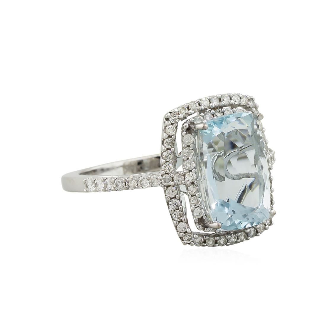 One electronically tested 14KT white gold ladies cast aquamarine and diamond ring with a bright polish finish. The featured aquamarine is set within tiered diamond bezels supported by a lattice under gallery and diamond set shoulders, completed by a one and one-half millimeter wide band. Trademark is Orianne. Identified with markings of "14K". Condition is new, good workmanship. Containing: One prong set rectangular cushion mixed cut natural aquamarine, measuring 11.80 x 7.80 x 6.00mm, 10%. bulge factor, approximate weight of 3.95ct., clarity is eye clean, type I, light, very slightly grayish, very slightly greenish blue color, (GIA vslgB 3/3), cut is good. Transmitting light with no distortion, transparent. Graded in the setting.Seventy-Six prong set round brilliant cut diamonds approximate. Total Weight of 76 Stones = 0.56ct. Graded in the setting. Clarity: SI-2 to I-2. Color: G - I. Total Weight of Colored Stones 3.95ct. Total Weight of Diamonds 0.56ct. Total Weight of Ring 3.62gm. AIG Appraised at $4,450.00.