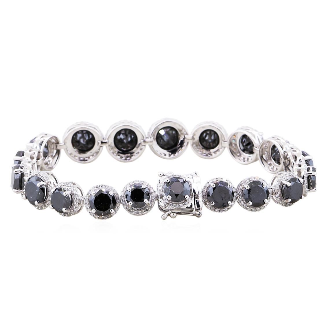 One electronically tested 14KT white gold ladies cast & assembled black and white diamond bracelet. Seven and one-quarter inch length bracelet features a flexible graduating black and white diamond bezel ribbon, terminating in a concealed clasp with twin safeties. Bright polish finish. Trademark is Orianne. Identified with markings of "14K". Condition is new, good workmanship. Containing: Nineteen prong set round brilliant cut diamonds approximate. Total Weight of 19 Stones = 28.08ct. Indications of multiple laboratory enhancements. The specific gravity of black diamond is 3.120 to 3.165. Diamond tester results are non-reactive. Graded in the setting. Clarity D‚class‚. Color: Fancy Black; Irradiated. Four Hundred Sixteen prong set single cut diamonds approximate. Total Weight of 416 Stones = 2.13ct. Graded in the setting. Clarity: I-1 to I-2. Color: G - I. Total Weight of Diamonds 30.21ct. Total Weight of Bracelet 20.49gm. AIG Appraised at $30,995.00.