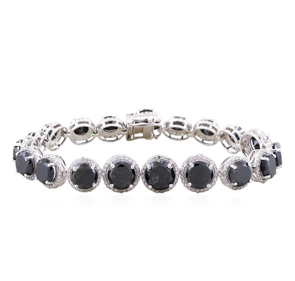 One electronically tested 14KT white gold ladies cast & assembled black and white diamond bracelet. Seven and one-quarter inch length bracelet features a flexible graduating black and white diamond bezel ribbon, terminating in a concealed clasp with twin safeties. Bright polish finish. Trademark is Orianne. Identified with markings of "14K". Condition is new, good workmanship. Containing: Nineteen prong set round brilliant cut diamonds approximate. Total Weight of 19 Stones = 28.08ct. Indications of multiple laboratory enhancements. The specific gravity of black diamond is 3.120 to 3.165. Diamond tester results are non-reactive. Graded in the setting. Clarity D‚class‚. Color: Fancy Black; Irradiated. Four Hundred Sixteen prong set single cut diamonds approximate. Total Weight of 416 Stones = 2.13ct. Graded in the setting. Clarity: I-1 to I-2. Color: G - I. Total Weight of Diamonds 30.21ct. Total Weight of Bracelet 20.49gm. AIG Appraised at $30,995.00.