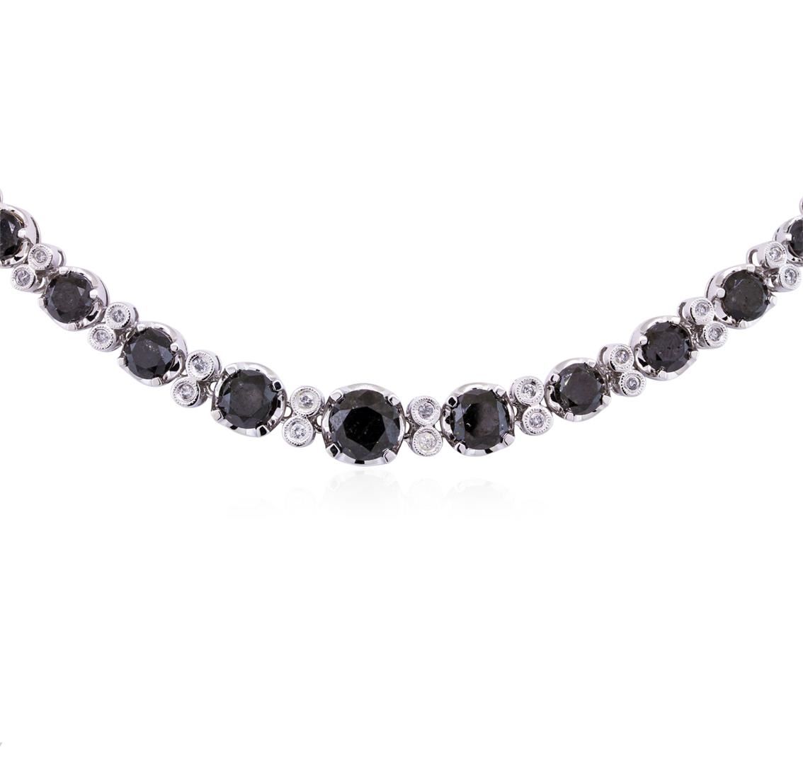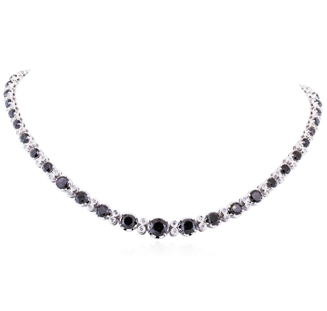 One electronically tested 14KT white gold ladies cast & assembled black and white diamond necklace. Seventeen and three-quarter inch length necklace composed of a flexible graduating ribbon of black and white diamonds, terminating in a concealed clasp with twin safeties. Bright polish finish with milgrain detailing throughout. Trademaek is Orianne. Identified with markings of "14K". Condition is new, good workmanship. Containing: 50 prong set fancy black round brilliant cut diamonds, measuring 8.00mm to 4.00mm (depth est.) approximate total weight of 50 stones = 30.69ct. Indications of multiple labratory enhancements. 100 bezel set SI-1 to I-2 round brilliant cut diamonds, measuring 1.70-1.40x 0.93mm (depth est.) approximate total weight of 100 stones = 1.52ct. Graded in setting. AIG Appraised at $31,520.00.