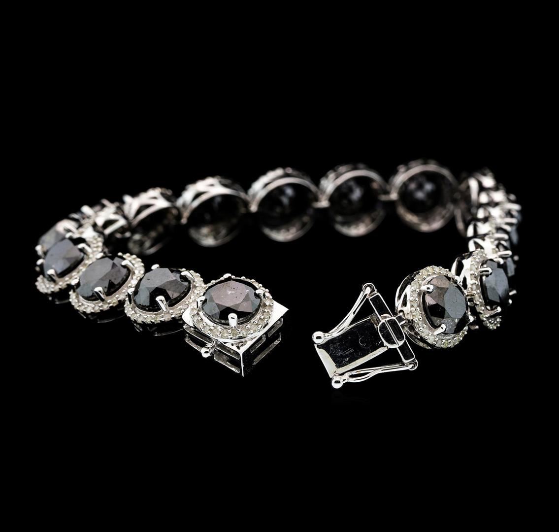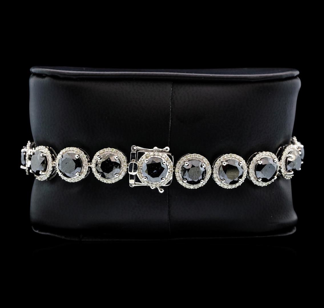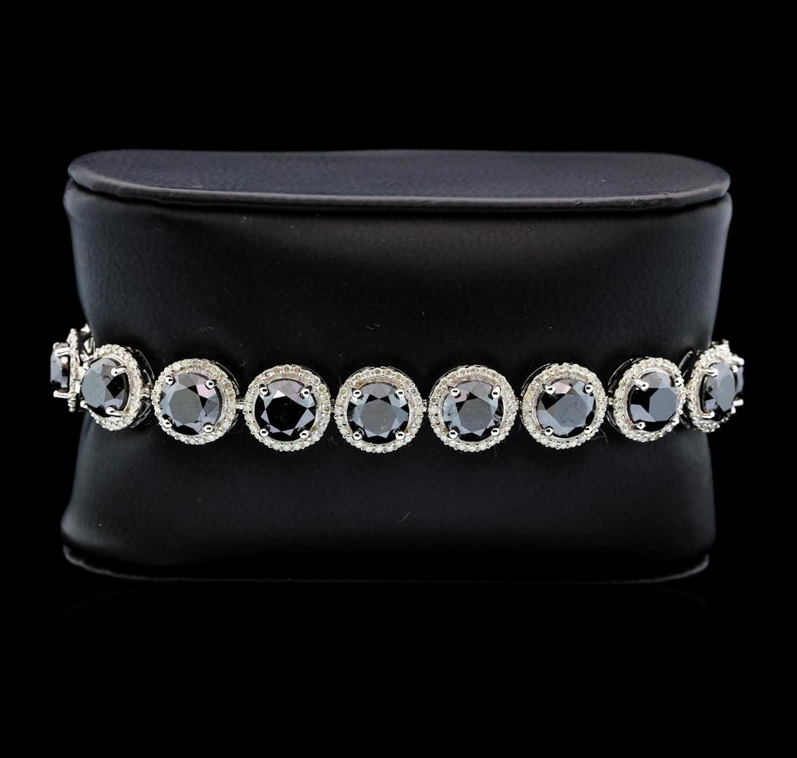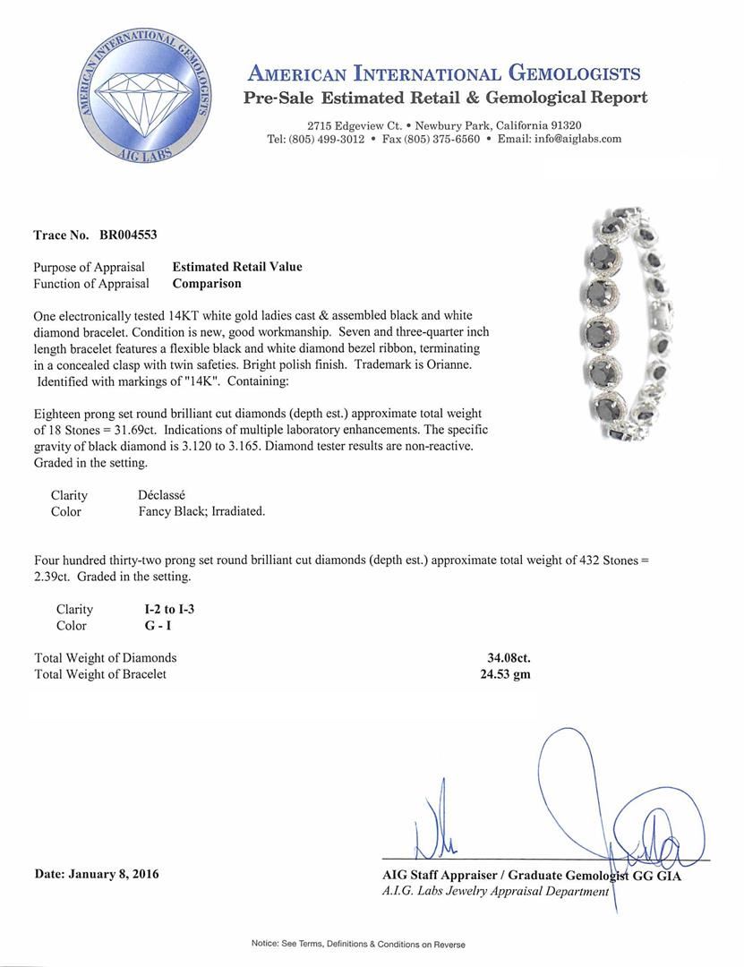 One electronically tested 14KT white gold ladies cast & assembled black and white diamond bracelet. Seven and three-quarter inch length bracelet features a flexible black and white diamond bezel ribbon, terminating in a concealed clasp with twin safeties. Bright polish finish. Trademark is Orianne. Identified with markings of "14K". Condition is new, good workmanship. Containing: Eighteen prong set round brilliant cut diamonds (depth est.) approximate total weight of 18 Stones = 31.69ct. Indications of multiple laboratory enhancements. The specific gravity of black diamond is 3.120 to 3.165. Diamond tester results are non-reactive. Graded in the setting. Clarity D‚class‚. Color: Fancy Black; Irradiated. Four Hundred Thirty-Two prong set round brilliant cut diamonds (depth est.) approximate total weight of 432 Stones = 2.39ct. Graded in the setting. Clarity: I-2 to I-3. Color: G - I. Total Weight of Diamonds 34.08ct. Total Weight of Bracelet 24.53gm. AIG Appraised.